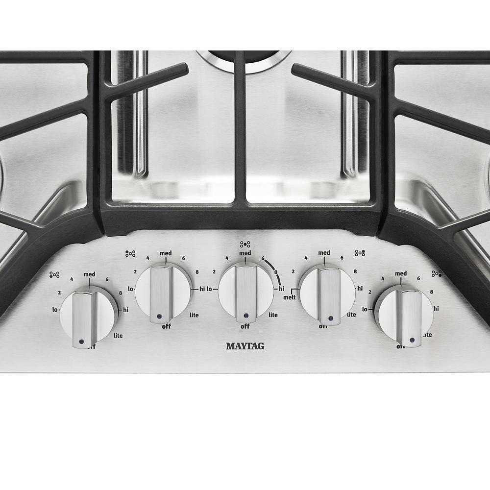 The Maytag MGC7536DS is a bold and dependable 36-inch gas cooktop engineered for powerful cooking performance. With 5 sealed gas burners, including a high-performance 15,000 BTU Power™ Burner for fast boiling and searing, it delivers flexibility and strength for all your culinary needs. The 5,000 BTU simmer burner provides delicate, even heat for sauces and gentle cooking. Continuous cast-iron grates allow you to easily slide pots and pans across burners without lifting, while sealed burners make cleanup easy by containing spills. The Stainless Steel finish resists fingerprints and offers a sleek, professional look. Easy-to-use front controls provide precise temperature adjustment, and the heavy-duty knobs offer tactile, ergonomic feedback. The MGC7536DS is backed by a dependable reputation and built for the long haul.