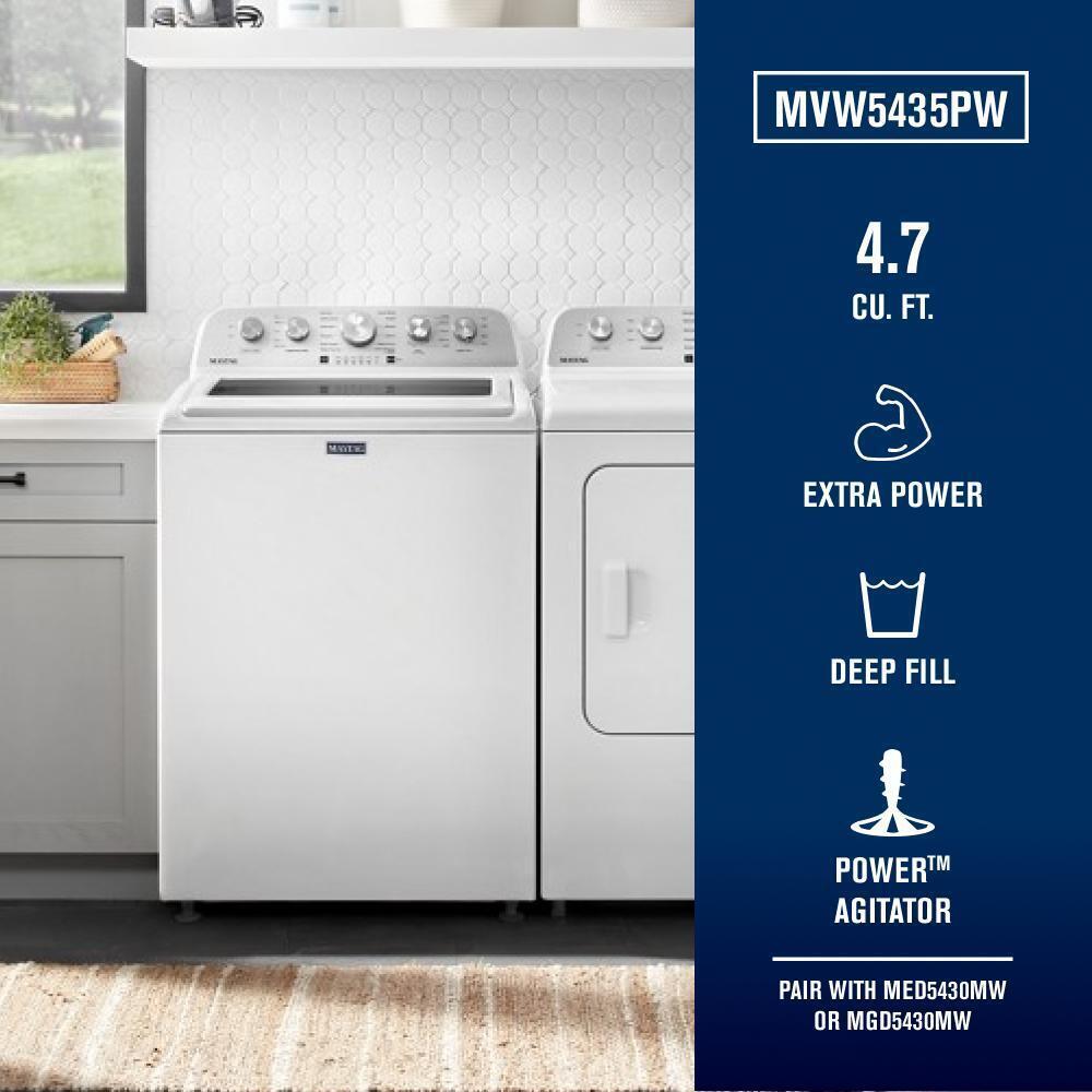 This 4.7 cu. ft. capacity top load washer from Maytag delivers the stain-fighting power that s built to handle tough loads. Use Extra Power for boosted stain fighting on any wash cycle while the Power(TM) agitator uses a 360-degree wash action to break up messes and knock the stubborn out of stains. The Deep Fill option delivers more water when you want it while the built-in water faucet rinses, spot treats or soaks clothes right in the washer-no extra steps needed. The durable 5-knob console along with the 10-year limited parts warranty* on the drive motor and wash basket tie it all together to help you easily power through laundry day. *See product warranty for details.