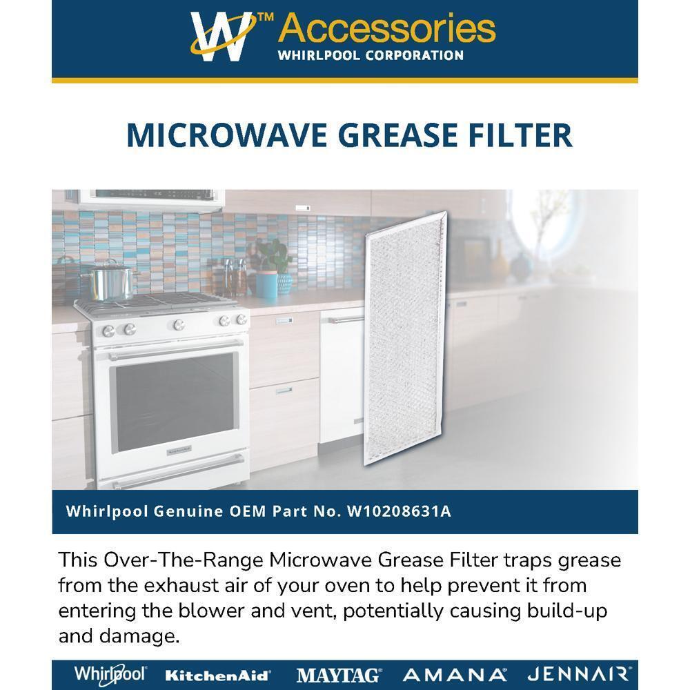 This Over-The-Range Microwave Grease Filter traps grease from the exhaust air of your oven to help prevent it from entering the blower and vent, potentially causing build-up and damage. If your current filter can no longer be cleaned and is not functioning properly, you should replace it promptly with this item. This chrome filter is an accessory that can be used across several brands; check to see if your model number is compatible. Size: approx. 13" L x 6" W. Replacing this part will require no disassembly or repair experience. You must unplug the microwave before installing this part.