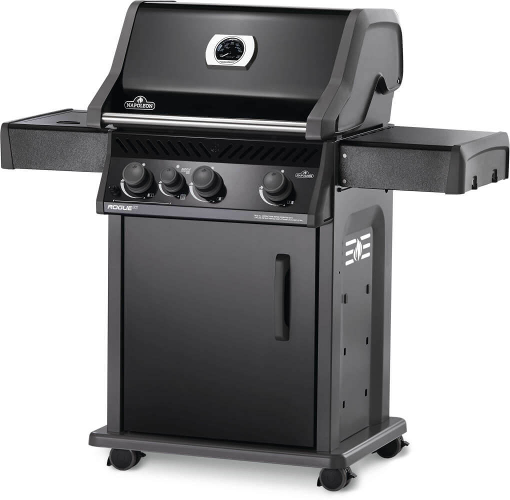 Napoleon's Rogue XT 425 Black Hood Propane Gas Grill with Infrared Side Burner has three burners, cast iron grids and a high top lid. This grill lights easily, every time, with a battery-free ignition. Grill the perfect steak using the integrated sizzle zone side burner or use it to make sauces and sides while grilling, and searing on the main area. The durable materials are both stylish and easy to maintain.