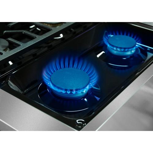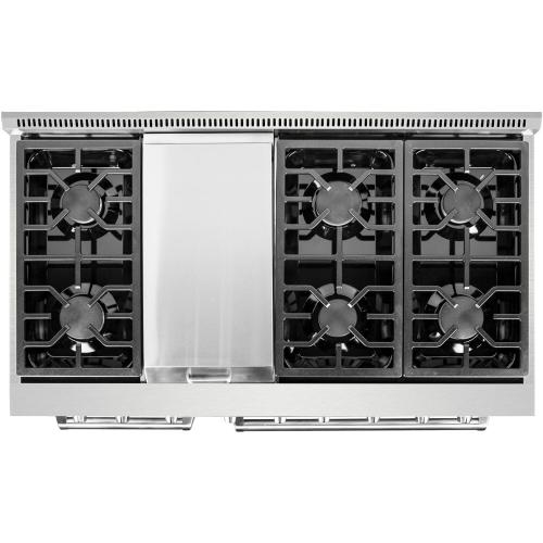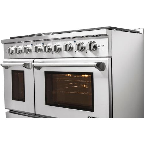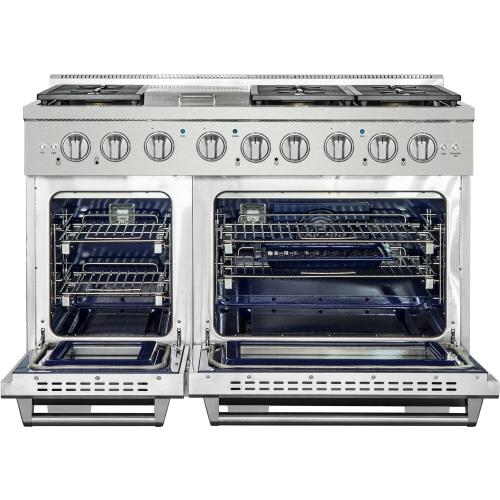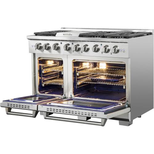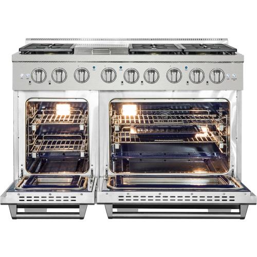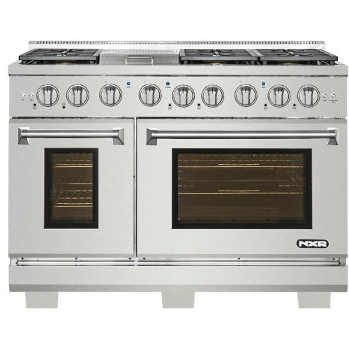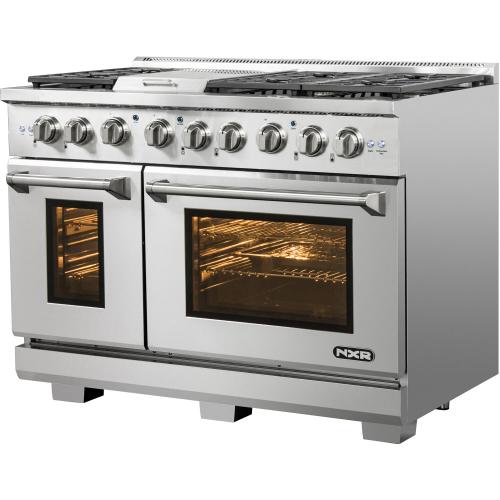 Designed to be the centerpiece of your kitchen, the NXR Culinary Series stainless steel 48-inch professional style dual fuel range features four German dual power burners, totaling 81,000 BTUs, over two convection ovens. Experience the best of both worlds, with our powerful gas cooktop and electric ovens. All burners feature a black porcelain drip tray, flat continuous cast iron grates, and the versatility of both high power and ultra-low simmer for ultimate cooking capabilities. This dual fuel range features a 18,000 BTU center griddle component to make breakfast a little more fun. Our convection ovens feature even cooking results in less time, a powerful Incoloy element broiler, extra-smooth adjustable gliding racks, and a beautiful blue porcelain interior for easy cleaning. Heavy-duty LED backlit knobs, hinges, and towel-bar handle complete the professional look and feel of this exceptional 48-inch range. Experience affordable luxury in your home with NXR.