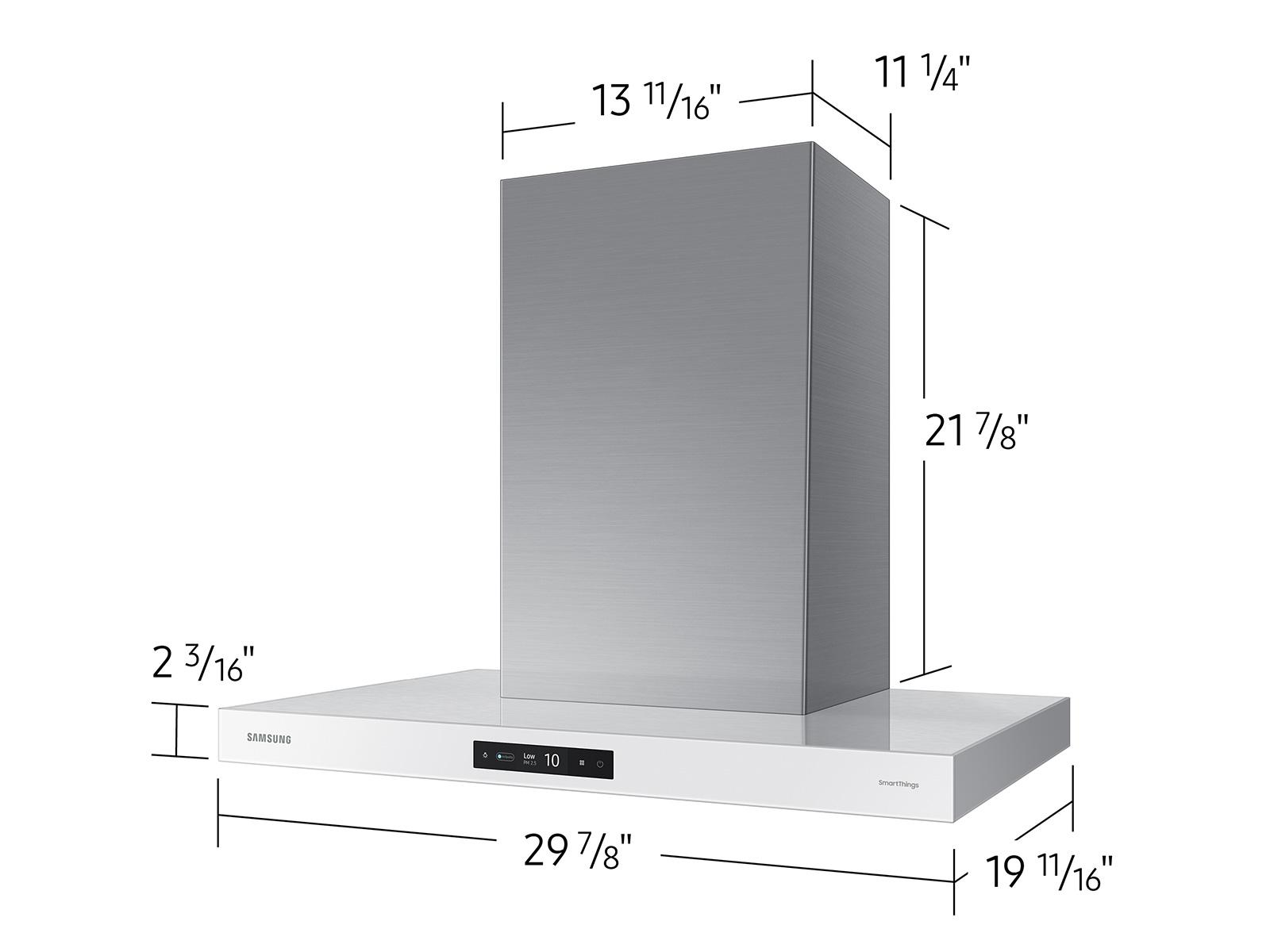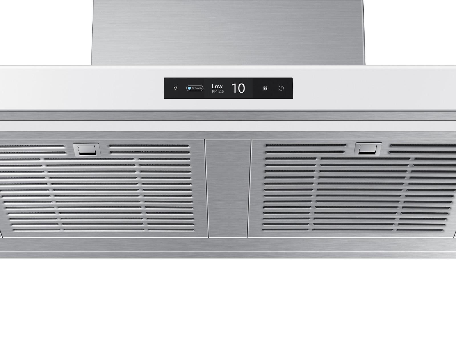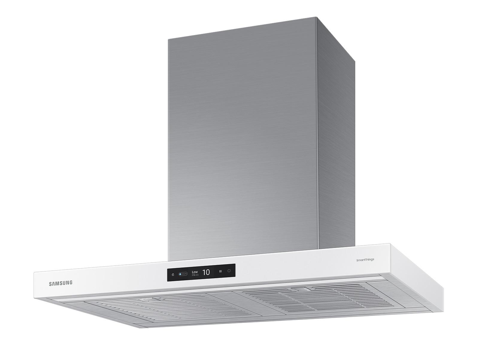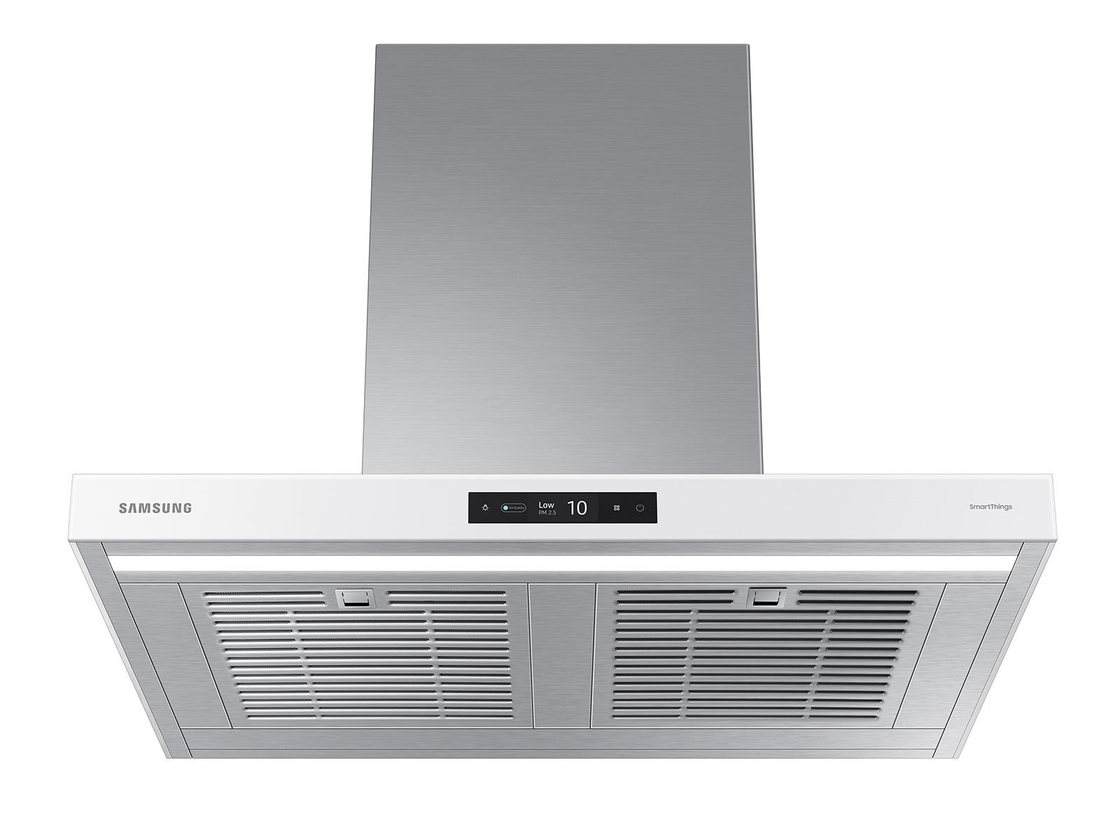 The Samsung NK30CB700W12 is a 30-inch Bespoke Smart Wall Mount Range Hood designed to deliver powerful ventilation with minimal noise. Equipped with a 630 CFM fan (pre-programmed to 390 CFM), it efficiently removes smoke and odors from your kitchen. The Triple Air Sensor continuously monitors air quality and automatically adjusts the fan speed as needed. With Wi-Fi connectivity and compatibility with the SmartThings App, you can control and monitor the hood remotely. The LCD touch controls provide intuitive operation, while the LED bar lighting illuminates your cooktop. Its dishwasher-safe baffle filters ensure easy cleaning, and the Clean White finish complements any modern kitchen design.