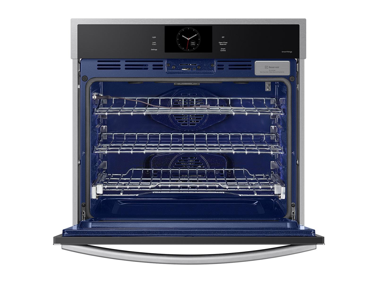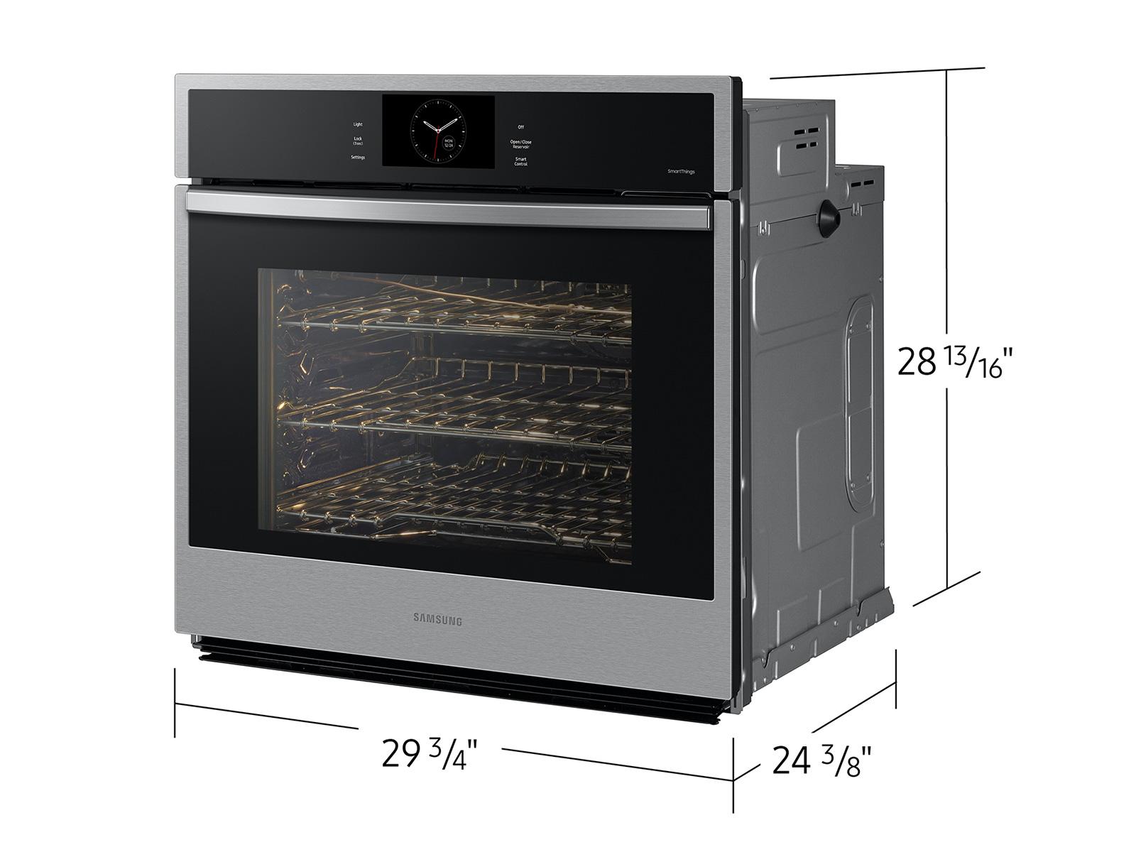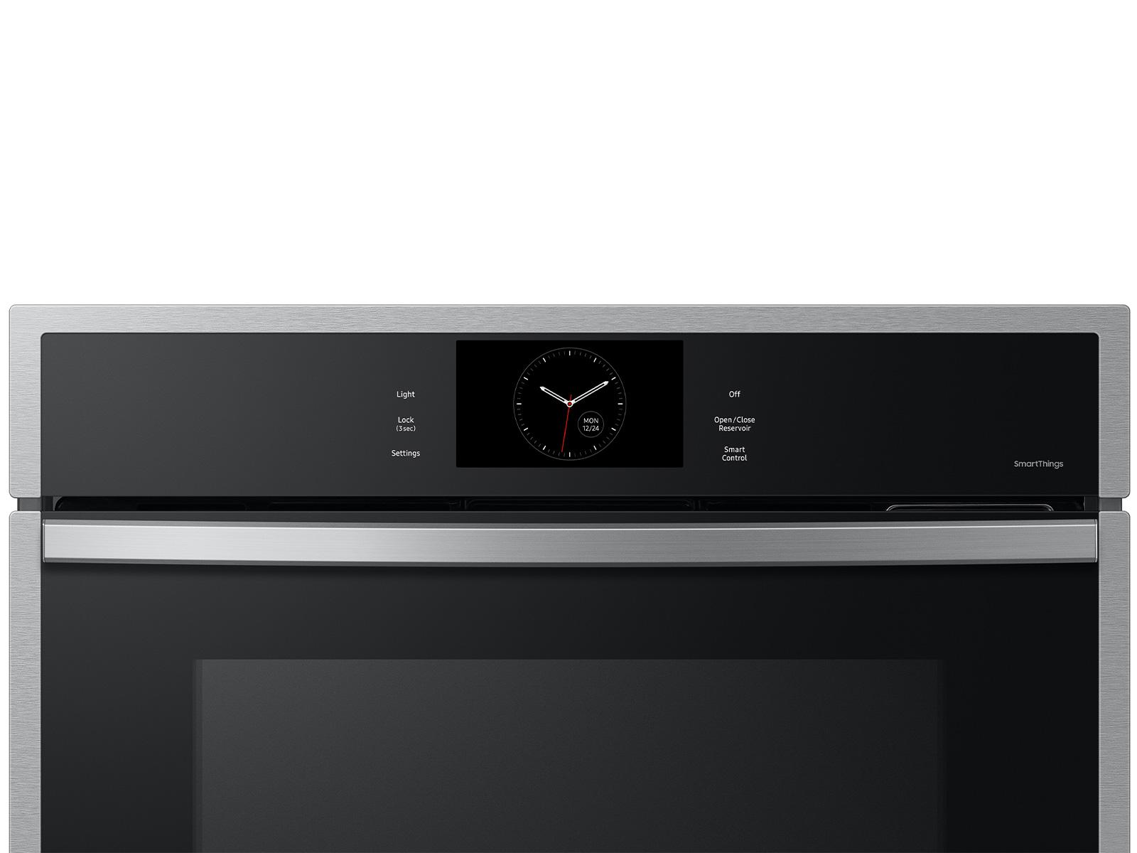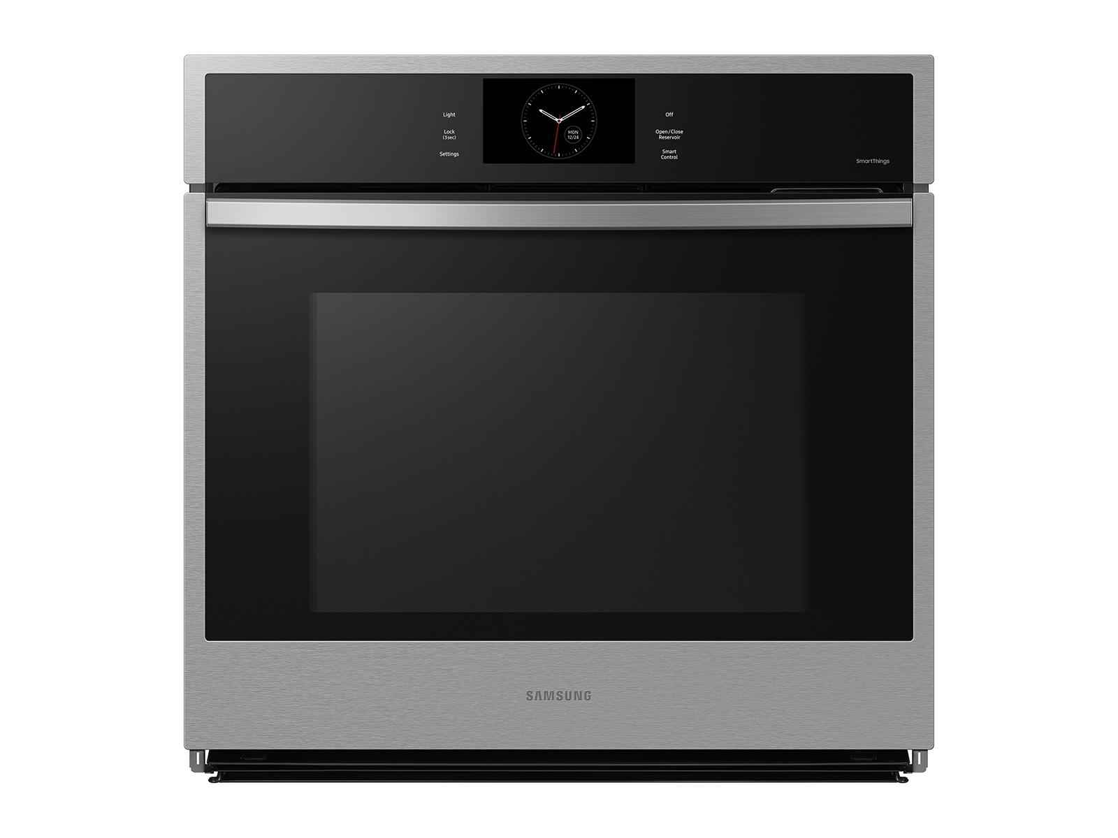 The brand Samsung NV51CG600SSR is a 30-inch single wall oven finished in stainless steel, offering a powerful steam cook function to enhance moisture and flavor while preserving nutrients. With true convection, it ensures even cooking and consistent results. The oven integrates SmartThings Wi‑Fi control for remote preheat and notifications. Additional features include a self-cleaning cycle, soft-close door, interior halogen lighting, and user-friendly touch controls. This oven brings convenience and precision to any kitchen.