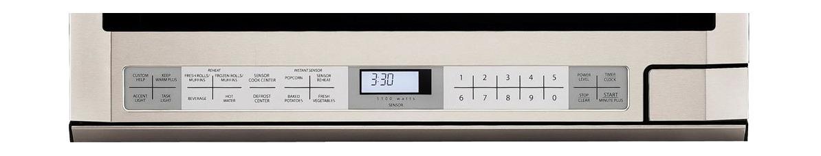 14-1/8\" Carousel Turntable Holds a 9\" x 13\" Dish Easy-to-Read 7-Digit 2-Color Display Over-the-Counter Microwave Oven Provides Task Lighting Sensor Programs: 11 Cook, 4 Reheat, and Popcorn Other Programs: 8 Instant Action, 4 Defrost