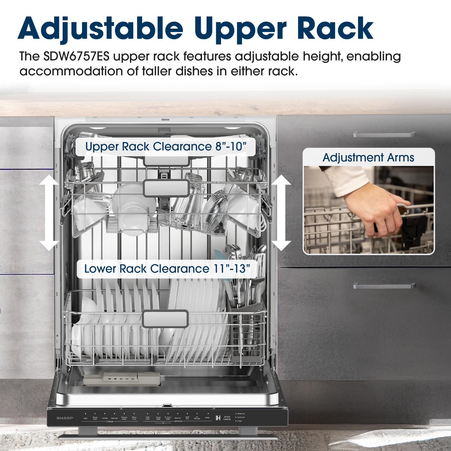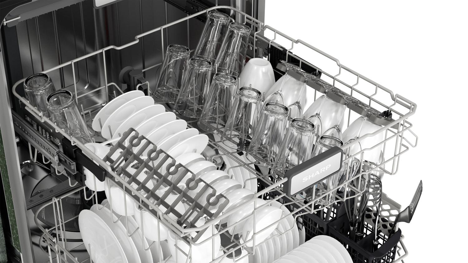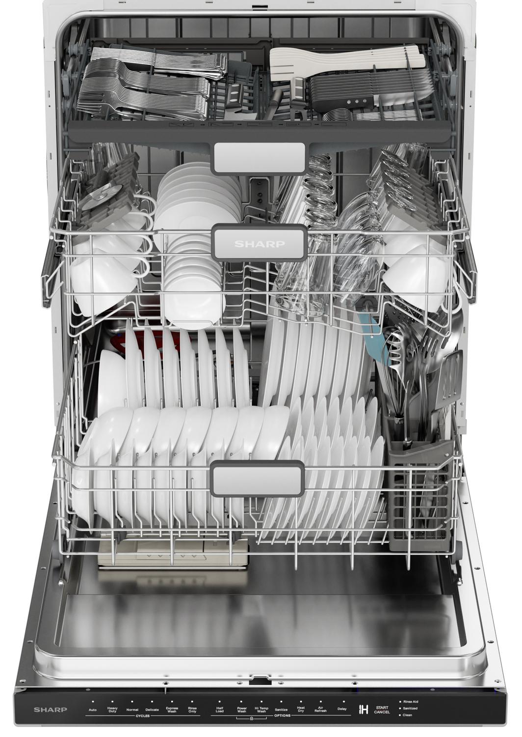 The 24 in. Sharp SDW6757ES stainless steel dishwasher balances features and options to make a better dishwashing experience for the heart of your home. With six washing cycles, seven options, outstanding washing power, and an adjustable third rack, the SDW6757ES is ready to clean up after the big celebrations and the cozy staycations!
