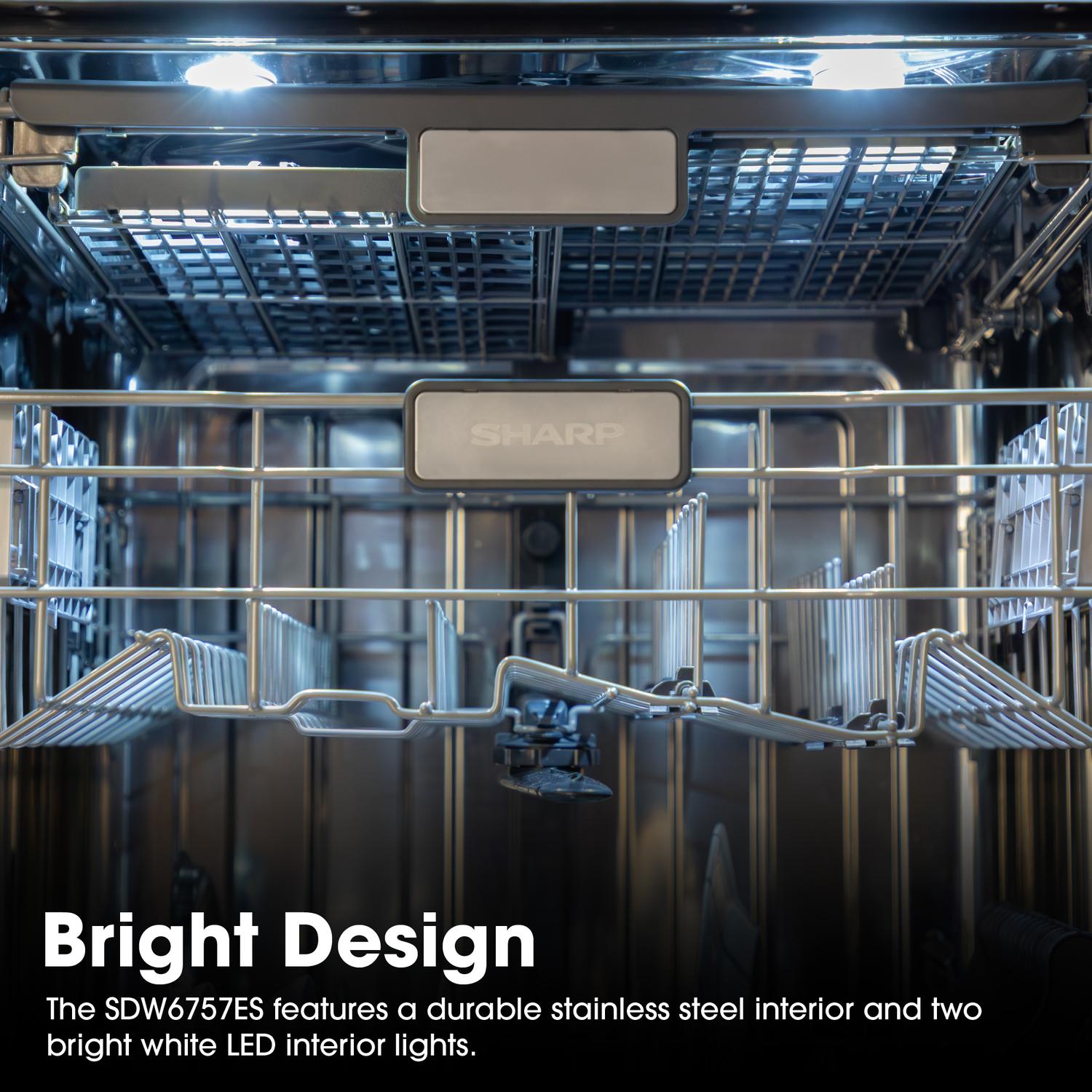 Classic and elegant, the 24-inch Sharp SDW6757ES dishwasher offers luxuries inside and out with two premium interior white LED lights. Feel the quality and strength of the premium smooth glide rails as the racks slide easily with the slightest touch. The brilliant, stainless steel finish is easy to clean and complements other stainless steel appliances, while the hidden control panel helps minimize distractions. The powerful and versatile features of this premium dishwasher give you more than peace of mind. The Sharp SDW6757ES slide-in dishwasher also gives you peace and quiet at a serene 45dB, with the Library Quiet washing cycle. Balance and Harmony. Exceptional Quality. The SDW6757ES Stainless Steel Dishwasher from Sharp.