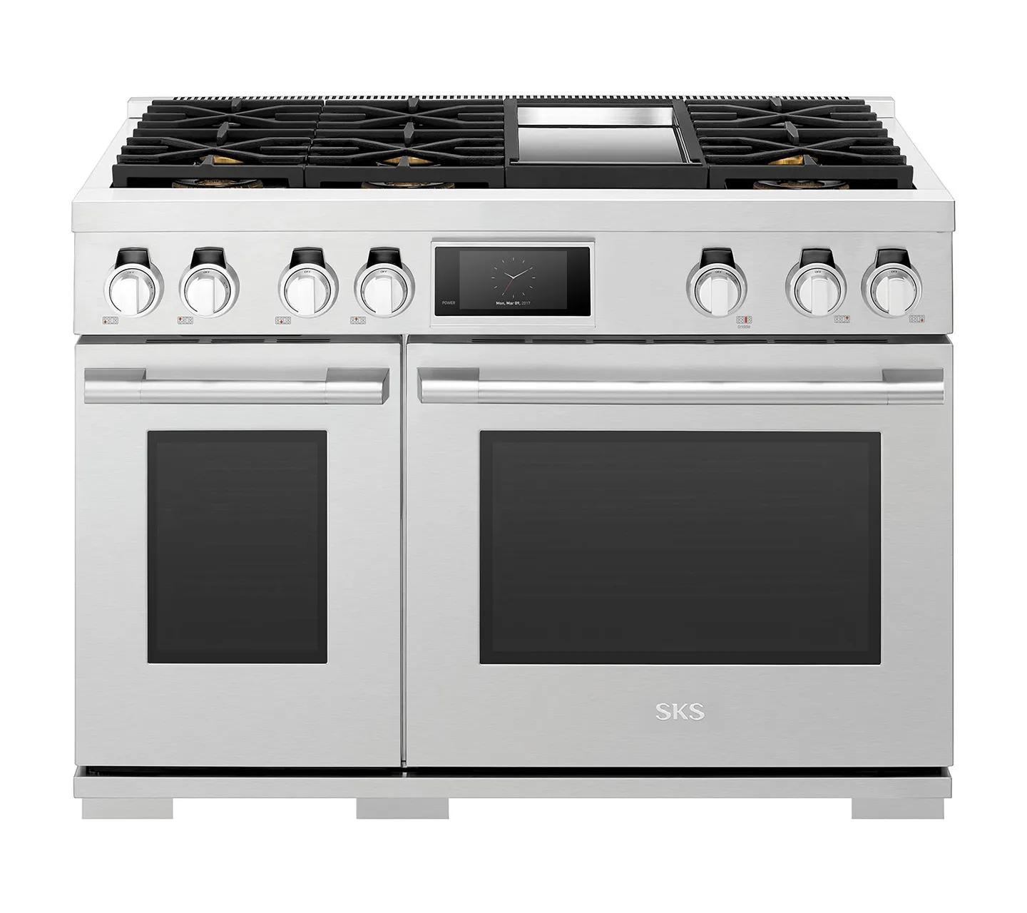 (P)The SKS 48-inch Gas Pro Range is a precise balance of power and finesse. Three Ultra-High(TM) Burners ensure you have all the heat you ll ever need for better searing and quick stir-frying. Three Ultra-Low(TM) Burners simmer down to maintain temps as low as 100 for delicate sauces and sugary confections. Add in our chromium griddle, 30-inch and 18-inch ovens and you ll have the confidence to take on almost any meal.(/P)
