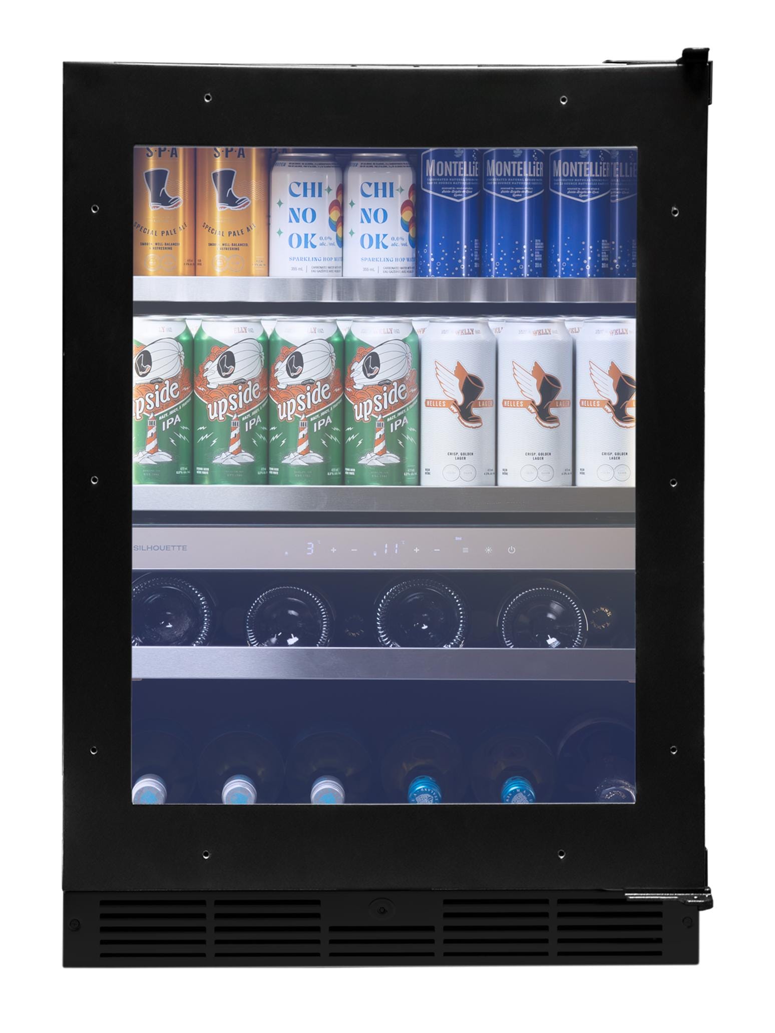 Discover the perfect blend of style and functionality with the Silhouette Pro Gen 3 - SPRWBC052D3SS-P 24" Built-in Wine and Beverage Center Panel-Ready. This sleek unit features a built-in design that accommodates up to 79 beverage cans and 19 standard Bordeaux wine bottles. Its panel-ready door ensures seamless integration with your cabinetry for a custom look. The dual-zone cooling system provides ideal storage conditions with an upper temperature range of 34(degree)F - 50(degree)F (1(degree)C - 10(degree)C) and a lower range of 50(degree)F - 64(degree)F (10(degree)C - 18(degree)C). Enjoy the convenience of a patent-pending wine shelf with adjustable bottle spacing, soft-close, full-extension wine shelf, and optimized shelf spacing for tall cans and upright bottles. Additional features include zero-clearance hinges, anti-glare LED side lighting, and a field-reversible door swing for ultimate versatility.