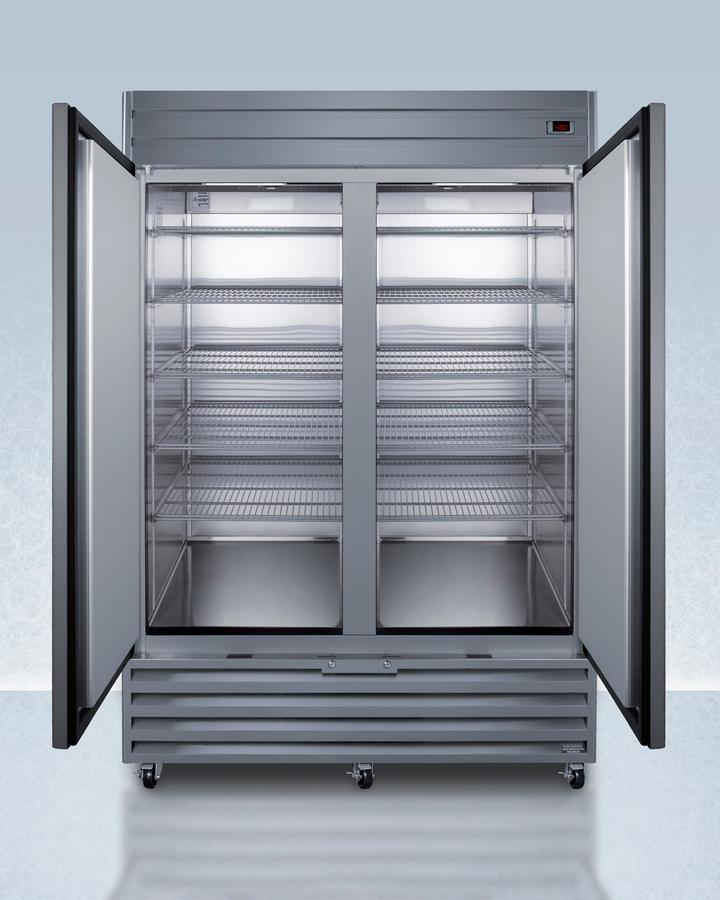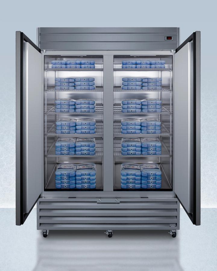 Accucold's lineup of general purpose refrigeration includes TAA compliant choices in a variety of sizes manufactured in North America for reliable cold storage. Made in North America, model ACFF436L is an upright freezer with a self-closing French door swing and nearly 39 cu.ft. of interior storage capacity. Adjustable cantilevered shelving lets you accommodate a variety of sizes to maximize the interior space. Powerful fan-forced cooling ensures fast temperature recovery and even cold air distribution. This model uses frost-free operation for easy user maintenance, with audible high/low temperature alarms to warn if the unit goes out of range. Designed for optimum general purpose storage in healthcare and laboratory settings, the temperature range is -15 C to -20.5 C. The ACFF436L is fully constructed from stainless steel inside and out, with six pre-installed casters for easy mobility. LED lighting offers an efficient presentation and front locks add security as needed. This unit features a high efficiency compressor and rear condenser. The sealed rear offers a better fit and easier cleanup with no exposed coils. Eco-friendly R290a refrigerant helps to ensure a greener footprint compliant with the latest CARB regulations. For a matching refrigerator, see Accucold's ACRR432L.