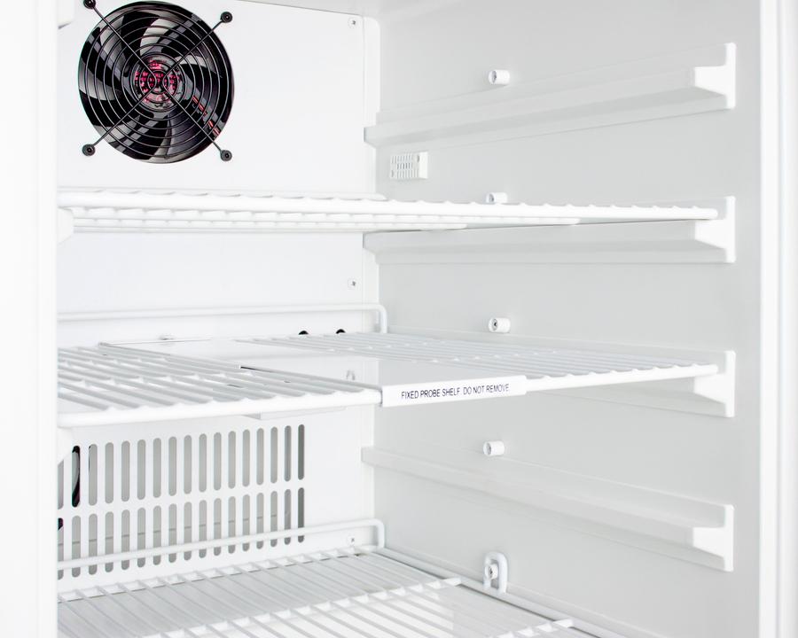 Accucold s Pharmaceutical Series features refrigeration specially designed to meet current CDC, VFC and VFA guidelines for vaccine storage, with built-in choices sized to fit under ADA compliant counters. The ACR45L all-refrigerator is sized at just under 32" high, with a front-breathing design for built-in installation under lower ADA compliant counters and fully finished cabinet that also allows freestanding use. Its sealed back allows for a better fit and easier cleanability. A hospital grade cord with a 'green dot' plug provides added safety in high traffic areas and a factory-installed keyed lock is located towards the top of the unit for convenient security. The user-reversible door includes a side-mounted handle for added convenience, with a self-closing mechanism to ensure items aren't accidentally exposed to warm air. Four adjustable leveling legs allow you to raise the height for a better fit under standard countertops. For optimum temperature management, the ACR45L features an external control panel, allowing users to adjust and monitor the temperature without opening the door. Additionally, it is equipped with a thermometer that displays the current, minimum, and maximum temperatures to the nearest tenth of a degree with a readout viewable in Celsius or Fahrenheit (as recommended by the CDC, VFC and VFA). The thermometer includes an audible alarm to warn users if the interior has gone out of the programmed temperature range. The buffered temperature probe is encased in a bottle filled with glass beads and secured inside the center shelf to best simulate the temperature of other stored contents, resulting in the utmost accuracy for temperature reporting. We include a pre-installed 3/8" probe hole for users who wish to install additional monitoring equipment as needed. (Note: for this unit with a NIST calibrated thermometer, see the ACR45LCAL.) Inside, the 2.65 cu.ft. interior includes two adjustable wire shelves for optimum circulation, with one center fixed shelf to keep the temperature probe in place. The foamed-in-place cabinet and door liner affords added insulation of the interior for improved temperature stability, while an internal fan helps to evenly cool the interior from top to bottom. This model utilizes frost-free operation to minimize user maintenance. LED lighting helps to provide a clean, energy efficient view. At just under 20" wide, the ACR45L is the perfect storage solution for doctors' offices, veterinary clinics, pharmacies, and similar healthcare environments. Additional purpose-built choices for vaccine storage are available in a variety of sizes. Browse the Accucold website to explore the full product line. Note: Accucold's Pharmaceutical Series refrigerators have been tested to operate within 2.5 C of the temperature set point and are intended for a wide variety of healthcare storage applications, including vaccines, specimens, pharmaceuticals, and other medical, biological, life science, and industrial materials. At this time, Accucold refrigerators have not been evaluated to the new NSF 456 standard. As referenced in the current Vaccine Storage and Handling Toolkit, these units incorporate microprocessor controls and forced air circulation for stable operation between 2 and 8 C. For additional temperature assurance, the CDC recommends a calibrated digital data logger (DDL), which can be added with the factory-installed option DL2B or addition of the DL2BKit accessory. For units with a +/-1 C variation, see Accucold s Performance Series.