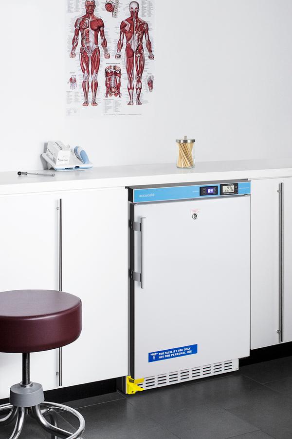 Accucold s Pharmaceutical Series features refrigeration specially designed to meet current CDC, VFC and VFA guidelines for vaccine storage, with built-in choices sized to fit under ADA compliant counters. The ACR45LSTO is an all-refrigerator sized at just under 32" high. It features a front-breathing design for built-in installation under lower ADA compliant counters, with a fully finished cabinet that also allows freestanding use. This unit is equipped with our step-to-open door pedal, allowing users to open the door without touching the handle for more hygienic use. Its sealed back allows for a better fit and easier cleanability. A hospital grade cord with a 'green dot' plug provides added safety in high traffic areas and a factory-installed keyed lock is located towards the top of the unit for convenient security. Four adjustable leveling legs allow you to raise the height for a better fit under standard countertops. For optimum temperature management, the ACR45LSTO features an external control panel, allowing users to adjust and monitor the temperature without opening the door. Additionally, it is equipped with a thermometer that displays the current, minimum, and maximum temperatures to the nearest tenth of a degree with a readout viewable in Celsius or Fahrenheit (as recommended by the CDC, VFC and VFA). The thermometer includes an audible alarm to warn users if the interior has gone out of the programmed temperature range. The buffered temperature probe is encased in a bottle filled with glass beads and secured inside the center shelf to best simulate the temperature of other stored contents, resulting in the utmost accuracy for temperature reporting. We include a pre-installed 3/8" probe hole for users who wish to install additional monitoring equipment as needed. (Note: for this unit with a NIST calibrated thermometer, see the ACR45LCALSTO.) Inside, the 2.65 cu.ft. interior includes two adjustable wire shelves for optimum circulation, with one center fixed shelf to keep the temperature probe in place. The foamed-in-place cabinet and door liner affords added insulation of the interior for improved temperature stability, while an internal fan helps to evenly cool the interior from top to bottom. This model utilizes frost-free operation to minimize user maintenance. LED lighting helps to provide a clean, energy efficient view. At just under 20" wide, the ACR45LSTO is the perfect storage solution for doctors' offices, veterinary clinics, pharmacies, and similar healthcare environments. Additional purpose-built choices for vaccine storage are available in a variety of sizes. Browse the Accucold website to explore the full product line. Note: Accucold's Pharmaceutical Series refrigerators have been tested to operate within 2.5 C of the temperature set point and are intended for a wide variety of healthcare storage applications, including vaccines, specimens, pharmaceuticals, and other medical, biological, life science, and industrial materials. At this time, Accucold refrigerators have not been evaluated to the new NSF 456 standard. As referenced in the current Vaccine Storage and Handling Toolkit, these units incorporate microprocessor controls and forced air circulation for stable operation between 2 and 8 C. For additional temperature assurance, the CDC recommends a calibrated digital data logger (DDL), which can be added with the factory-installed option DL2B or addition of the DL2BKit accessory. For units with a +/-1 C variation, see Accucold s Performance Series.