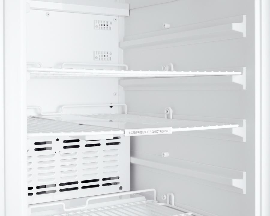 Accucold s Pharmaceutical Series features refrigeration specially designed to meet current CDC, VFC and VFA guidelines for vaccine storage, with built-in choices sized to fit under ADA compliant counters. The ACR46GLCAL is an all-refrigerator sized at just under 32" high. It features a front-breathing design for built-in installation under lower ADA compliant counters, with a fully finished cabinet that also allows freestanding use. Its sealed back allows for a better fit and easier cleanability. A hospital grade cord with a 'green dot' plug provides added safety in high traffic areas and a factory-installed keyed lock is located towards the top of the unit for convenient security. The user-reversible double pane tempered glass door provides a full view of interior contents, with a stainless steel frame for added durability in any setting. A side-mounted handle is included for user convenience, and four adjustable leveling legs allow you to raise the height for a better fit under standard countertops. For optimum temperature management, the ACR46GLCAL features an external control panel, allowing users to adjust and monitor the temperature without opening the door. A pre-installed NIST certified thermometer is calibrated in our own ISO/IEC 17025:2017 accredited laboratory to provide an external readout of the current and high/low temperatures to the nearest tenth of a degree (as recommended by the CDC, VFC and VFA). The display is switchable between Celsius or Fahrenheit at the touch of a button. The thermometer includes an audible alarm to warn users if the interior has gone out of the programmed temperature range. The buffered temperature probe is encased in a bottle filled with glass beads and secured inside the center shelf to best simulate the temperature of other stored contents, resulting in the utmost accuracy for temperature reporting. We include a pre-installed 3/8" probe hole for users who wish to install additional monitoring equipment as needed and a certificate of calibration for your facility's records. Inside, the 2.65 cu.ft. interior includes two adjustable wire shelves for optimum circulation, with one center fixed shelf to keep the temperature probe in place. The foamed-in-place cabinet and door liner affords added insulation of the interior for improved temperature stability, while an internal fan helps to evenly cool the interior from top to bottom. This model utilizes frost-free operation to minimize user maintenance. LED lighting helps to provide a clean, energy efficient view. At just under 20" wide, the ACR46GLCAL is the perfect storage solution for doctors' offices, veterinary clinics, pharmacies, and similar healthcare environments. For this unit with a solid door, see model ACR45LCAL. Additional purpose-built choices for vaccine storage are available in a variety of sizes. Browse the Accucold website to explore the full product line. Note: Accucold's Pharmaceutical Series refrigerators have been tested to operate within 2.5 C of the temperature set point and are intended for a wide variety of healthcare storage applications, including vaccines, specimens, pharmaceuticals, and other medical, biological, life science, and industrial materials. At this time, Accucold refrigerators have not been evaluated to the new NSF 456 standard. As referenced in the current Vaccine Storage and Handling Toolkit, these units incorporate microprocessor controls and forced air circulation for stable operation between 2 and 8 C. For units with a +/-1 C variation, see Accucold s Performance Series.