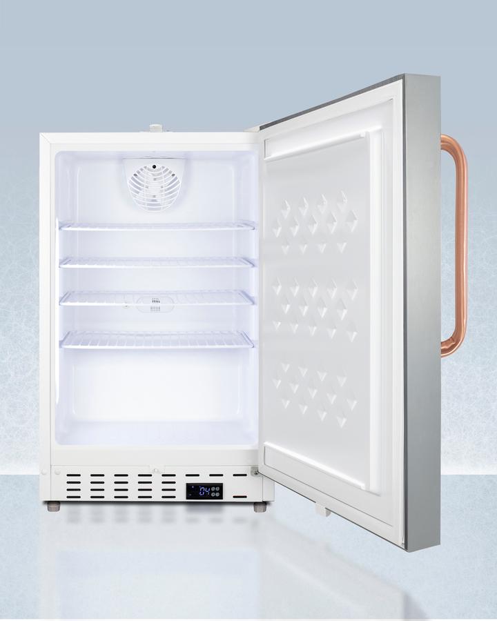 Accucold offers a quality selection of 21" wide built-in undercounter all-refrigerators designed for installation under lower ADA compliant counters, with advanced features for user convenience. The ADA404REFSSTBC is sized at 32" high to fit under lower counters complying with ADA guidelines for accessibility. The fully finished textured white cabinet allows freestanding use, while the front-breathing system means this unit can be built-in with minimum clearance. The user-reversible stainless steel door is 3" thick for efficient insulation, with a top-mounted lock for added security and convenient access. A digital thermostat, located in the kickplate, makes for easy temperature management with a readout in Fahrenheit or Celsius. This unit comes with a hospital grade cord with a green dot plug for added safety in high traffic areas. Powerful magnetic gaskets ensure a tight seal. The ADA404REFSSTBC includes a factory-installed towel bar style handle made from pure copper. Through its natural antimicrobial properties, copper will kill microbes, including viruses, in a shorter timeframe than most other metal surfaces allowing for a safer, cleaner user experience. Inside, the ADA404REFSSTBC is designed to operate between +2(degree)C and +8(degree)C as recommended for the storage of select pharmaceuticals and other medical supplies. An LED light located on the front left side of the unit attractively illuminates the interior when the door opens. Automatic defrost operation ensures minimal user maintenance, with an internal fan to help promote even cooling throughout the 3.32 cu.ft. interior. Adjustable wire shelves allow you to rearrange the interior to best suit your storage needs. As recommended by the CDC, this unit has a flat door liner to ensure users don't store sensitive contents on the door. The user-set high and low temperature alarms provide added security should the temperature go beyond the setpoint, while the open door alarm sounds if the door is ajar beyond one minute for added peace-of-mind. These alarms can be disabled depending on your needs. A preinstalled probe hole is included to allow users to connect their own monitoring equipment. Sized at just under 21" wide, the ADA4040REFSSTBC makes an ideal choice for various facilities. For a complete set, pair this unit with the matching -20 C ADA305AFSSTBC all-freezer.