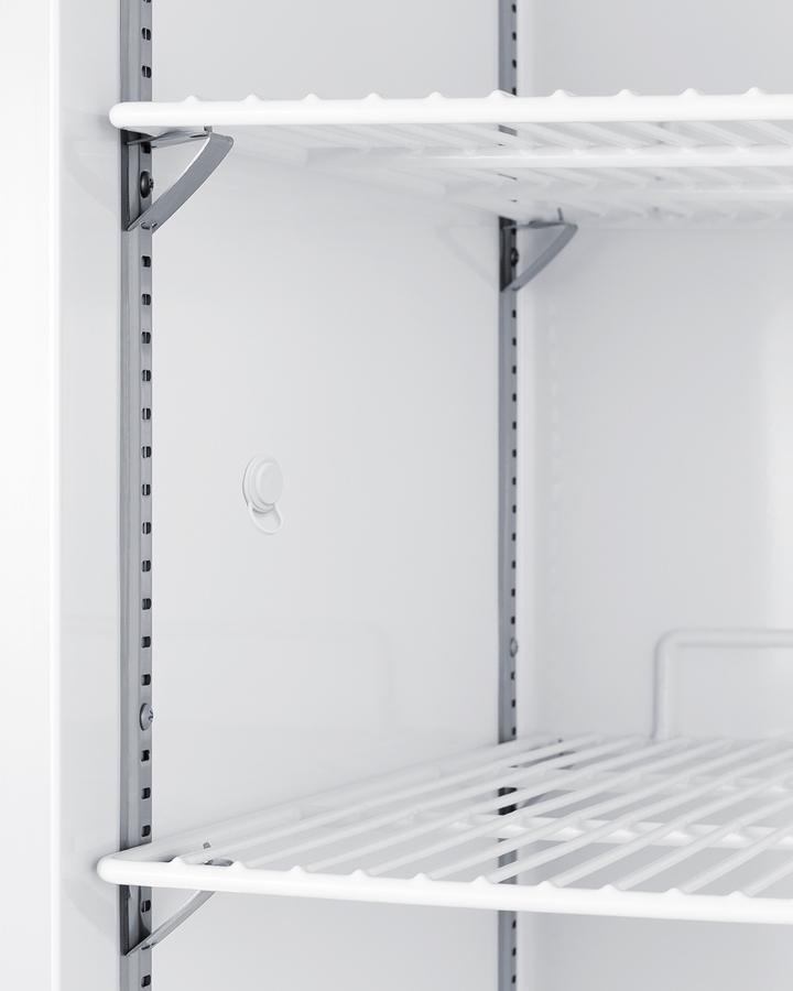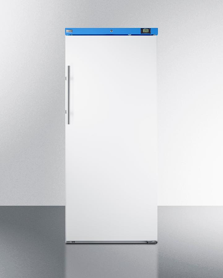 Summit Commercial manufactures a wide range of full-sized refrigeration choices approved to NSF-7 standards, including upright freezers. Model AFM19W is a large capacity front-opening freezer with an 18.3 cu.ft. interior. It is ETL-S listed to NSF-7 for commercial storage applications. This freezer utilizes a static manual defrost cooling system that offers more stabilized temperature than traditional no-frost units. The dial thermostat is located inside to prevent accidental temperature adjustments. Cantilevered shelving with epoxy-coated wire shelves allows you to adjust the interior to best accommodate a variety of sizes, while the flat door liner helps to fit deeper trays than units equipped with door racks. An automatic LED light makes it easy to see the full interior. This freezer comes in a white exterior finish. The keyed lock is conveniently located towards the top of the unit for easier user access. The reversible door includes an easy-grip handle in a brushed aluminum finish. This unit includes a 9'5" long power cord with a hospital grade 'green dot' plug for a more secure connection, ideal for high traffic commercial environments. The cooling system utilizes hydrocarbon refrigerant for a greener footprint that meets CARB regulations. For advanced insulation, the door features a vacuum seal that keeps all cold air inside. In addition to this freezer, Summit Commercial manufactures a full lineup of full-sized commercial refrigerators and freezers, including reach-in style and frost-free options. Browse the full lineup to explore our catalog.