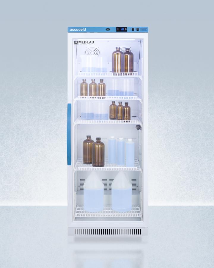 Accucold's Med-Lab Performance Series all-refrigerators are designed and purpose-built to meet the demanding needs of life science, laboratory, and medical cold storage applications, with a powder-coated silver ion handle that helps prevent germ spread. The ARG12ML is a 12 cu.ft. all-refrigerator with an adjustable control range from +2 to +10 C. The microprocessor temperature controller is externally located to minimize door openings, helping to protect stored contents from ambient temperature. The buffered temperature probe is encased in a glycol-filled bottle to better simulate temperature of the stored product, with an additional sensor that reads air temperature to ensure superior temperature control. The current and min/max temperature display is viewable in Celsius or Fahrenheit to the nearest tenth of a degree. The audible and visual temperature alarm sounds if the unit's interior goes out of range. Additional alarms include a power failure alert, door open alarm, and sensor failure alarm. This unit is equipped with remote alarm contacts in the rear and a 1/2" probe port on the right side to accept additional monitoring devices. A hospital grade cord with 'green dot' plug is also included for added safety in high traffic areas. Inside, the ARG12ML utilizes adjustable cycle defrost operation to avoid temperature spikes. Optimized forced air cooling with two internal fans ensures excellent temperature stability and uniformity with rapid recovery after door openings. The adjustable plastic-coated wire shelves can be positioned at 1/2" increments to accommodate virtually any sized item. We include seven shelves, more than competitor products providing to maximize interior shelving storage area. This unit includes LED internal lighting with an on/off rocker switch. The interior is constructed from white powder coated metal to ensure added durability and better temperature retention. The ARG12ML comes in a white cabinet finish with a blue accented control panel. The factory-installed antimicrobial handle is powder-coated with naturally occurring silver ions, which help to reduce the spread of germs, allowing for a safer, cleaner user experience. The user-reversible double pane tempered glass door provides a full view of the interior. This model includes a factory-installed lock and ships with two keys for staff use. Powerful magnetic gaskets ensure a positive seal. Designed with hydrocarbon refrigerant, the ARG12ML provides an energy efficient solution to laboratory and life science storage. This unit is Pyxis, Omnicell, and AcuDose RX compatible. Additional sizes are available. Explore the full Med-Lab series at accucold.com/medlab. NOTE: Accucold refrigerators are purpose-built to the support meeting the current CDC (Centers for Disease Control) guidelines for the storage of vaccines. At this time, Accucold refrigerators have not been evaluated to the new NSF 456 standard. As referenced in the current Vaccine Storage and Handling Toolkit, these units incorporate microprocessor controls and forced air circulation for stable operation. For additional temperature assurance, the CDC recommends a calibrated digital data logger (DDL), which can be added with the factory-installed option DL2B or addition of the DL2BKit accessory.