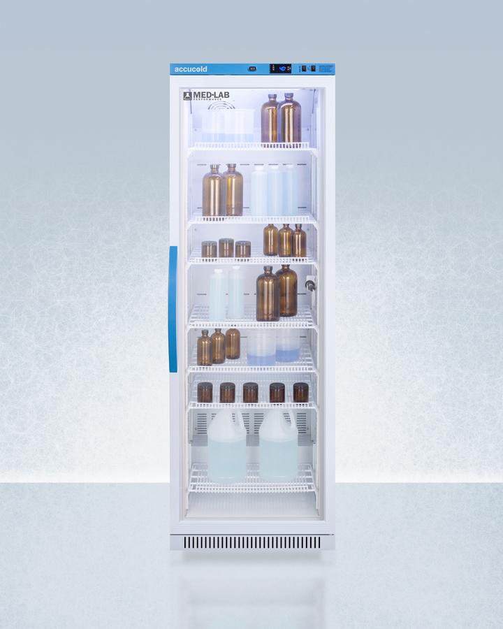 Accucold's Med-Lab Performance Series all-refrigerators are designed and purpose-built to meet the demanding needs of life science, laboratory, and medical cold storage applications, with a powder-coated silver ion handle that helps prevent germ spread. The ARG15ML is a 15 cu.ft. all-refrigerator with an adjustable control range from +2 to +10 C. The microprocessor temperature controller is externally located to minimize door openings, helping to protect stored contents from ambient temperature. The buffered temperature probe is encased in a glycol-filled bottle to better simulate temperature of the stored product, with an additional sensor that reads air temperature to ensure superior temperature control. The current and min/max temperature display is viewable in Celsius or Fahrenheit to the nearest tenth of a degree. The audible and visual temperature alarm sounds if the unit's interior goes out of range. Additional alarms include a power failure alert, door open alarm, and sensor failure alarm. This unit is equipped with remote alarm contacts in the rear and a 1/2" probe port on the right side to accept additional monitoring devices. A hospital grade cord with 'green dot' plug is also included for added safety in high traffic areas. Inside, the ARG15ML utilizes adjustable cycle defrost operation to avoid temperature spikes. Optimized forced air cooling with two internal fans ensures excellent temperature stability and uniformity with rapid recovery after door openings. The adjustable plastic-coated wire shelves can be positioned at 1/2" increments to accommodate virtually any sized item. We include seven shelves, more than competitor products providing to maximize interior shelving storage area. This unit includes LED internal lighting with an on/off rocker switch. The interior is constructed from white powder coated metal to ensure added durability and better temperature retention. The ARG15ML comes in a white cabinet finish with a blue accented control panel. The factory-installed antimicrobial handle is powder-coated with naturally occurring silver ions, which help to reduce the spread of germs, allowing for a safer, cleaner user experience. The user-reversible double pane tempered glass door provides a full view of the interior. This model includes a factory-installed lock and ships with two keys for staff use. Powerful magnetic gaskets ensure a positive seal. Designed with hydrocarbon refrigerant, the ARG15ML provides an energy efficient solution to laboratory and life science storage. This unit is Pyxis, Omnicell, and AcuDose RX compatible. Additional sizes are available. Explore the full Med-Lab series at accucold.com/medlab. NOTE: Accucold refrigerators are purpose-built to the support meeting the current CDC (Centers for Disease Control) guidelines for the storage of vaccines. At this time, Accucold refrigerators have not been evaluated to the new NSF 456 standard. As referenced in the current Vaccine Storage and Handling Toolkit, these units incorporate microprocessor controls and forced air circulation for stable operation. For additional temperature assurance, the CDC recommends a calibrated digital data logger (DDL), which can be added with the factory-installed option DL2B or addition of the DL2BKit accessory.