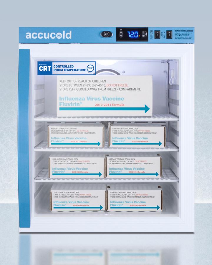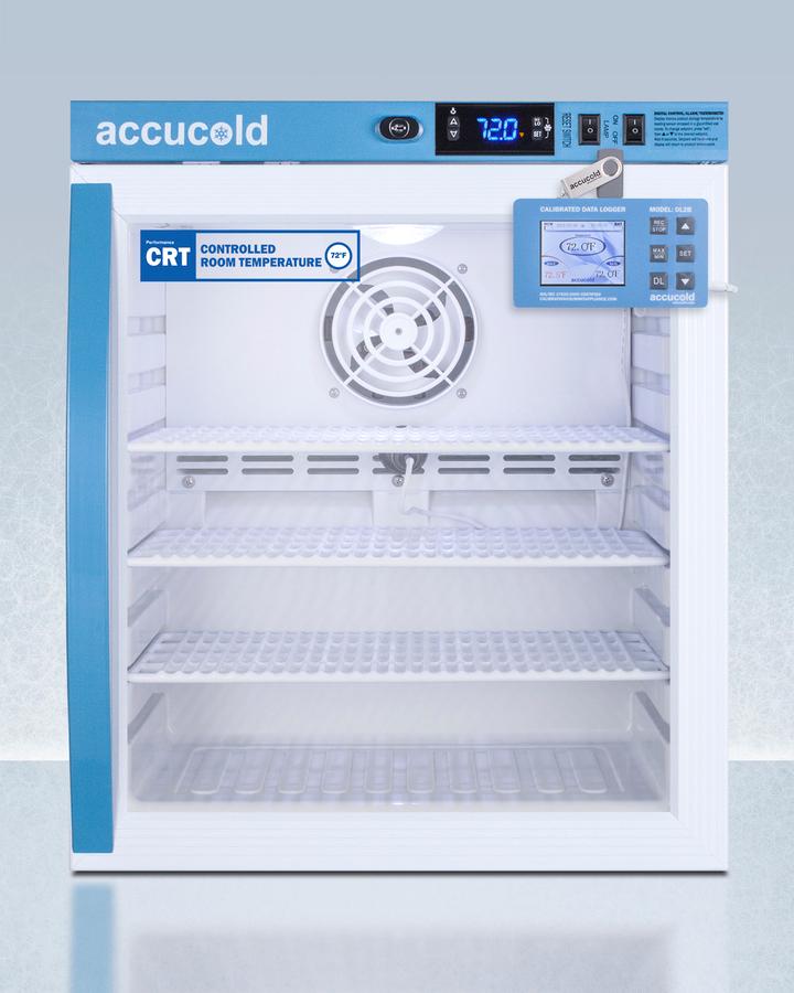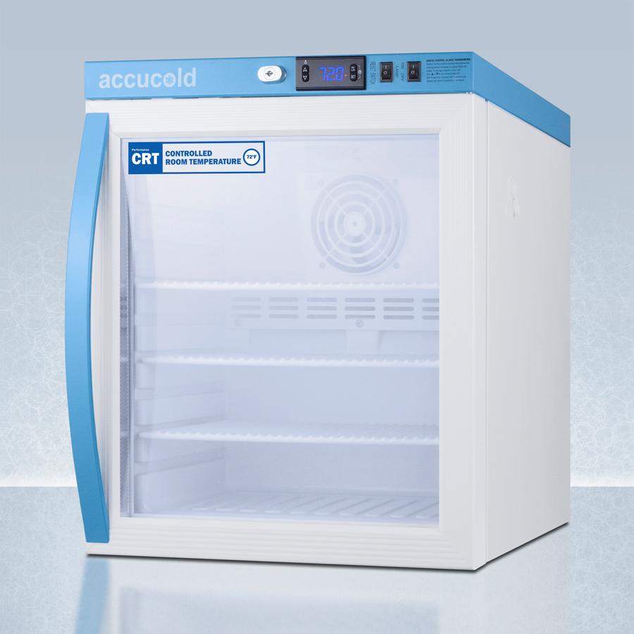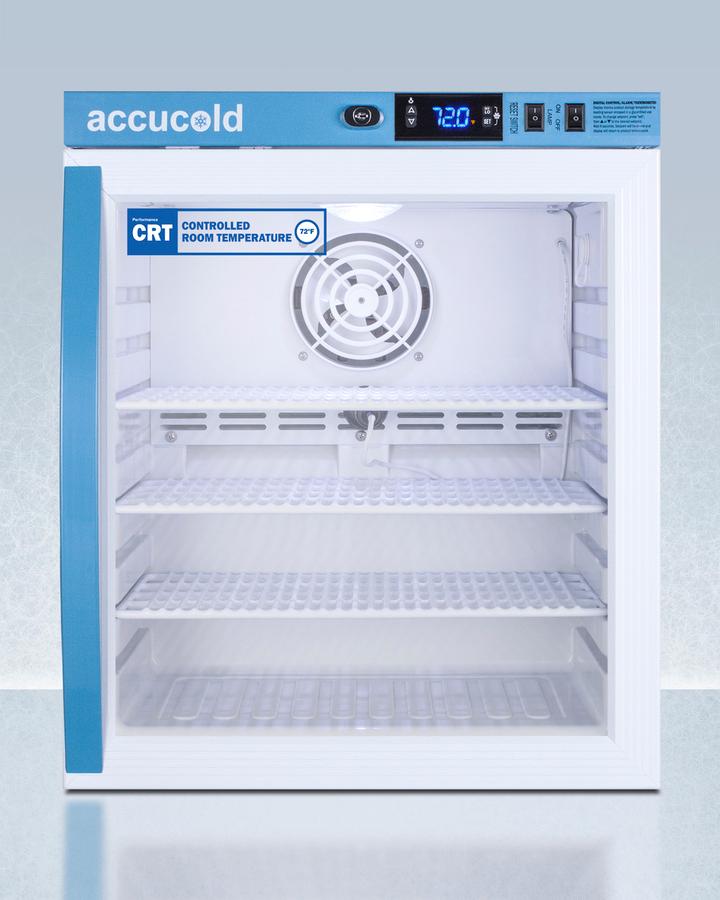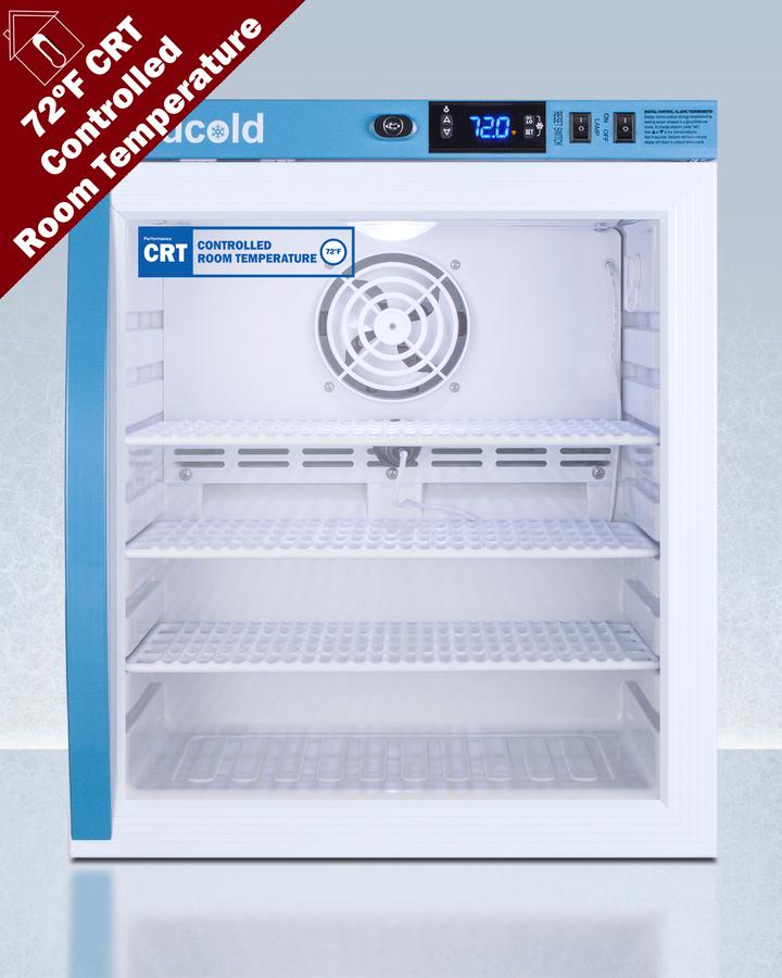 Accucold's Performance Series Controlled Room Temperature Cabinets offer purpose-built storage solutions for medication requiring a stable room temperature environment. The ARG1PV-CRT is a 1 cu.ft. countertop unit pre-set to 72 F, with an adjustable range from 68 to 77 F. The microprocessor temperature controller is externally located to minimize door openings, helping to protect stored contents from ambient temperature. The buffered temperature probe is encased in a glycol-filled bottle to better simulate temperature of the stored product, with an additional sensor that reads air temperature to ensure superior temperature control. The current and min/max temperature display is viewable in Celsius or Fahrenheit to the nearest tenth of a degree. The audible and visual temperature alarm sounds if the unit's interior goes out of range. Additional alarms include a power failure alert, door open alarm, and sensor failure alarm. This unit is equipped with remote alarm contacts in the rear and a 1/2" probe port on the right side to accept additional monitoring devices. A hospital grade cord with 'green dot' plug is also included for added safety in high traffic areas. Inside, the ARG1PV-CRT utilizes adjustable cycle defrost operation to avoid temperature spikes. Optimized forced air cooling with an internal fan to ensure excellent temperature stability and uniformity with rapid recovery after door openings. The adjustable plastic-coated wire shelves can be positioned at 1/2" increments to accommodate virtually any sized item. This unit includes LED internal lighting with an on/off rocker switch. The interior is constructed from white powder coated metal to ensure added durability and better temperature retention. The ARG1PV-CRT comes in a white cabinet finish with a blue accented control panel. The factory-installed antimicrobial handle is powder-coated with naturally occurring silver ions, which help to reduce the spread of germs, allowing for a safer, cleaner user experience. The double pane tempered glass door provides a full view of the interior. The user-reversible door ships with a right hand swing and self-closing function. This model includes a factory-installed lock and ships with two keys for staff use. Powerful magnetic gaskets ensure a positive seal. Designed with hydrocarbon refrigerant, the ARG1PV-CRT provides an energy efficient solution to stabilized room temperature storage, even when ambient temperatures can reach temperatures as cold as 68 F or warm as 86 F. This unit is Pyxis, Omnicell, and AcuDose RX compatible. Additional sizes, as well as solid door options, are also available.