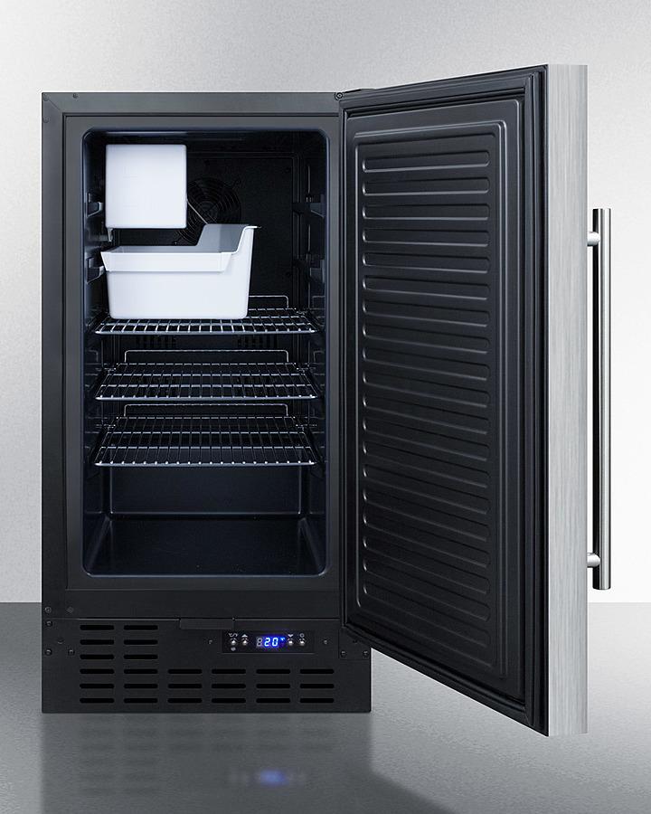 Summit brings convenient luxury under the counter with built-in icemakers uniquely sized for use in ADA compliant settings. Sized just under 18 inches wide and 32 inches high, the BIM18SSADA is ideal for installation under lower counters following ADA compliant guidelines. The 304 grade stainless steel wrapped door is user-reversible to best fit your setting. We include a pro style handle and front-mounted keyed lock for optional security. No drain or pump is required for use, offering more flexibility in where you place the unit. Inside, the BIM18SSADA can produce and hold 8 lbs. of crescent-shaped ice cubes in the removable bucket. Additional chrome shelves allow you to store other frozen items as needed. This unit utilizes frost-free operation to help reduce user maintenance. With its ideal size and user-friendly design, the BIM18SSADA is a great solution to keeping a steady supply of ice on hand in ADA compliant kitchen spaces. Matching 18 inch wide refrigerators, beverage centers, and wine cellars are also available. Browse our website to explore our complete selection.