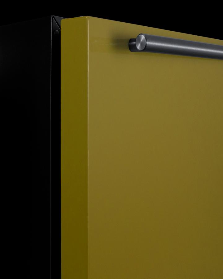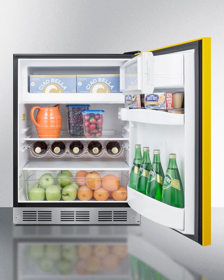 Make a statement under the counter with Summit's exclusive European collection of boldly colored refrigerators, available in standard or ADA compliant height. Model BRF631BKY is a 24" wide refrigerator-freezer with a generous capacity of more than 5 cu.ft. to meet general storage needs. The door comes in a bright saffron gold hue, with a sleek horizontally mounted stainless steel handle and matching stainless steel kickplate to complete the unique look. This unit has a jet black exterior cabinet. It is manufactured in Europe and modified in the United States with domestic steel finishing. Inside, the BRF631BKY features a dual evaporator to allow separated cooling of the fresh and frozen food sections. The refrigerated compartment utilizes low maintenance automatic defrost, while the interior freezer compartment is manual defrost to achieve lower storage temperatures ideal for ice cream and other frozen food. The deluxe interior includes adjustable glass shelves for spill-proof storage and easier cleaning, as well as a scalloped wine shelf to hold wine and champagne bottles safely in place. Door racks offer additional convenience for tall bottles and condiments and a clear crisper drawer ensures your produce is stored under the ideal conditions. This model includes automatic interior lighting and an adjustable dial thermostat. Additional colors are available, including emerald green, cobalt blue, and lavender. Browse the full Summit selection to find the perfect addition to your kitchen.