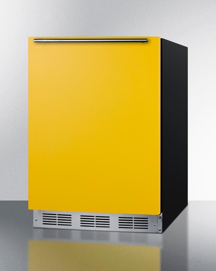 Make a statement under the counter with Summit's exclusive European collection of boldly colored refrigerators, available in standard or ADA compliant height. Model BRF631BKYADA is a 24" wide refrigerator-freezer sized at just 32" high for use in ADA compliant settings, with a generous capacity of more than 5 cu.ft. to meet general storage needs. The door comes in a bright saffron gold hue, with a sleek horizontally mounted stainless steel handle and matching stainless steel kickplate to complete the unique look. This unit has a jet black exterior cabinet. It is manufactured in Europe and modified in the United States with domestic steel finishing. Inside, the BRF631BKYADA features a dual evaporator to allow separated cooling of the fresh and frozen food sections. The refrigerated compartment utilizes low maintenance automatic defrost, while the interior freezer compartment is manual defrost to achieve lower storage temperatures ideal for ice cream and other frozen food. The deluxe interior includes adjustable glass shelves for spill-proof storage and easier cleaning, as well as a scalloped wine shelf to hold wine and champagne bottles safely in place. Door racks offer additional convenience for tall bottles and condiments and a clear crisper drawer ensures your produce is stored under the ideal conditions. This model includes automatic interior lighting and an adjustable dial thermostat. Additional colors are available, including emerald green, cobalt blue, and lavender. Browse the full Summit selection to find the perfect addition to your kitchen.