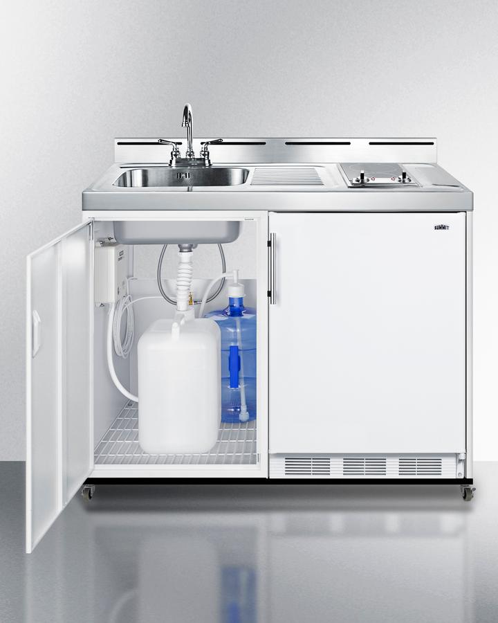 Summit brings innovation and convenience to non-traditional kitchen spaces with a new line of all-in-one kitchenettes designed for portable use in settings without standard water lines. Great for efficiency housing, off-grid living, and temporary or basement kitchens, the C48ELGLASSPUMPMB is a mobile 48 inch wide kitchenette composed of a refrigerator-freezer, 2-burner coil cooktop, sink, and storage cabinet that can be used as a portable water station. We include CKPUMPKIT, a package that features everything you need to connect the sink to a removable 5 gallon water jug to pump your fresh water through the included faucet. The kit comes with a 5 gallon jug, 6 gallon waste water container, 110V water pump, and all of the hardware and tubing you need to install your own "no plumbing" sink. The C48ELGLASSPUMPMB features a smooth 2-burner radiant cooktop in black glass for convenient stovetop heating. The cooktop includes its own pre-installed 3-prong cord for easy setup. It ships with our popular CT661W European refrigerator-freezer, offering 5.1 cu.ft. of storage capacity with adjustable glass shelves, door racks, a scalloped steel wine shelf, and large crisper drawer ideal for keeping produce at its best. Sized just under 48 inches wide, the C48ELGLASSPUMPMB comes in a shallow 24 inch depth ideal for smaller kitchens. Factory-installed casters allow you to smoothly move the unit as needed, with the front two casters equipped with locks to stay in place. This unit features a classic white cabinet finish with a durable stainless steel work surface and backguard. For more storage options, add our APSS48 appliance station shelf or our selection of wall cabinets. This unit ships on one pallet in three overboxed packages (kitchenette, refrigerator, and pump kit). Just slide the refrigerator in, install the pump kit, plug in the appliances, and enjoy your fully functional efficiency kitchen with no plumbing required!
