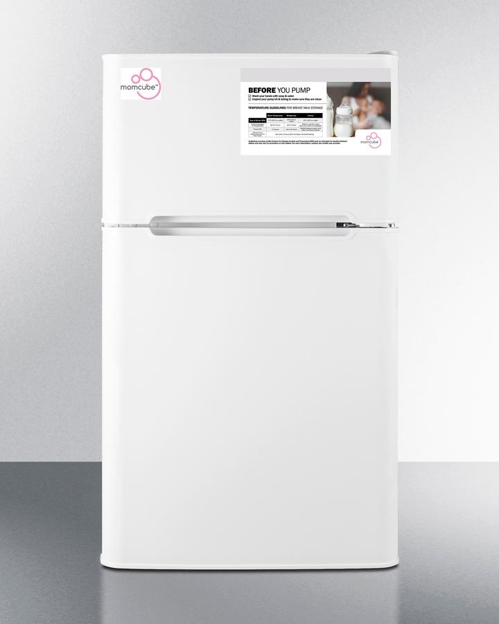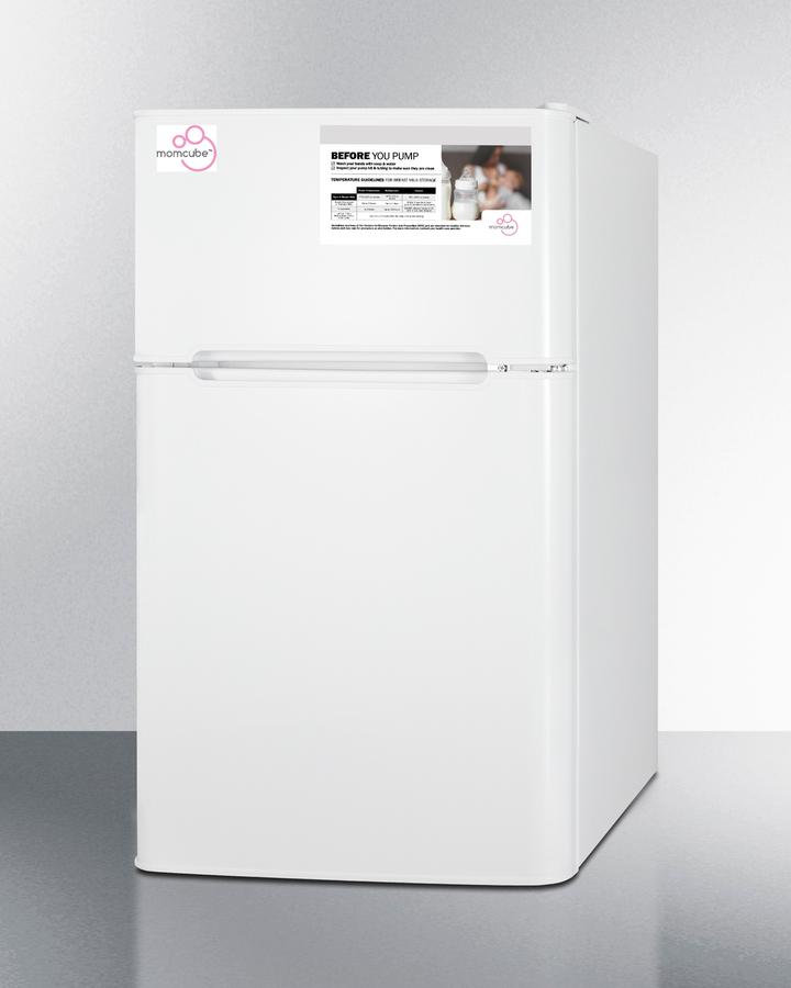 Summit's ENERGY STAR qualified collection of compact refrigerator-freezers offers uniquely sized units with energy-efficient performances for specialty storage applications. The CP34WMC is a counter height, two-door MOMCUBE(R) refrigerator-freezer sized at 19" wide, ideal for homes in need of extra storage space for nursing mothers. It features a classic white finish and reversible doors for added convenience. This unit is designed for freestanding use. It has a sealed back that allows for a better fit and easier cleaning. Two leveling legs help to ensure the unit is even when placed on uneven surfaces. Inside, the CP34WMC utilizes a dual evaporator system to separately cool the auto defrost refrigerator section and manual defrost freezer compartment for improved overall performance. The refrigerator includes an adjustable glass shelf for storing milk, ice packs, or other nursing-related items. Two wire door racks and a pull-out drawer provide additional storage as needed. A dial thermostat with seven temperature settings make for easy temperature management, while LED lighting illuminates the white interior for an easy view of stored contents. The generously sized separate freezer compartment includes a large door shelf for long-term storage of breast milk. The CP34WMC is ENERGY STAR qualified with an efficient performance designed to save on utility costs and energy usage. With its unique size and quality design, this unit is ideal for mothers looking for affordable, reliable short and long-term breast milk storage at home.