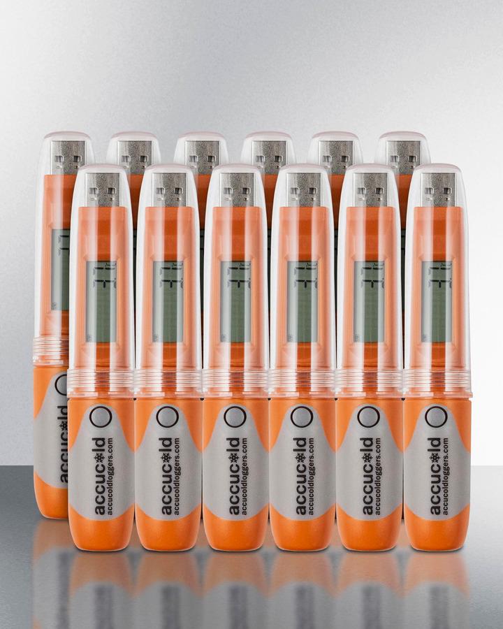 Accucold offers a range of user-friendly options for versatile and reliable temperature logging. The DLSA11-12P is a set of 12 DLSA11 standalone temperature loggers ideal for use when transporting items that need to be monitored. The compact size makes it easy to place in the logged area without compromising capacity. The logger includes an LCD screen with a digital display of the temperature to the nearest tenth of a degree, as recommended by the CDC for vaccine storage. You can also view the average temperature and mean kinetic temperature, a simplified way of showing the overall effect of temperature fluctuation during the recording period. This unit includes a protective transparent case that allows you to view the data without disrupting recording. Designed for use with Windows-based platforms, the DLSA11 includes downloadable software that is easy to program to your specific needs. Users can set the recording interval from every 10 seconds to 24 hours and specify whether to display the temperature in Celsius or Fahrenheit. Users can also choose to set a minimum/maximum temperature alarm that will show a visual indicator alert if the temperature goes out of range. These readings will be color-coded in the data exports for easy analysis. The logger offers an accuracy range of .5 C in the temperature range of -20 to 40 C, and 1 C outside of this range. It records all data to the internal USB drive and can hold up to 32,000 readings. When you're ready to view your data, simply plug your logger into your computer and open the software in Excel, Adobe Illustrator, or PDF format. From there, you can easily view and export the data in graphical or tabular form. All DLSA11CAL loggers include a replaceable lithium battery and a low battery alert on the LCD display. For these loggers calibrated to NIST standards, see the DLSA11CAL-12P. There is a two week lead time for calibration services.