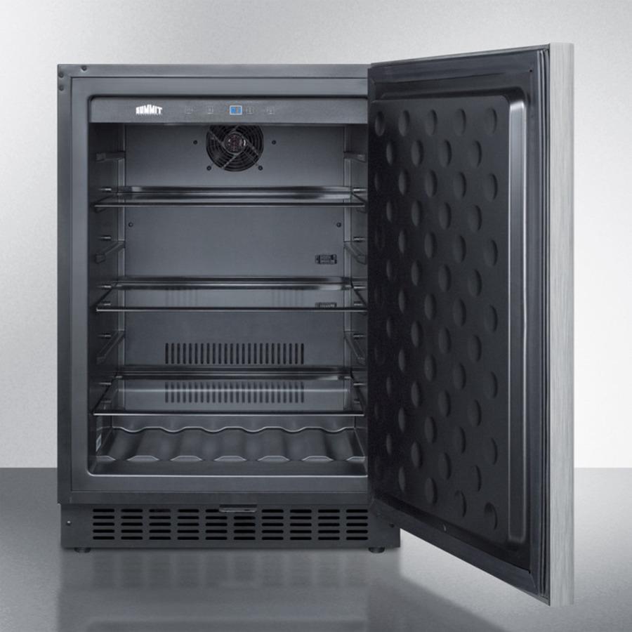 SUMMIT's FF64B Series brings quality and convenience under the counter with a fully featured lineup of built-in all-refrigerators. Sized with a convenient 24" footprint, the FF64BXSSHH refrigerator can be used built-in or freestanding. It has a black cabinet and stainless steel wrapped door. A thin stainless steel handle is mounted horizontally for a sleek, modern look. Inside, the FF64BXSSHH utilizes frost-free operation with fan-forced cooling to ensure low maintenance and even temperature distribution. Recessed LED lighting offers an attractive yet efficient look. The digital thermostat makes it easy to manage the interior temperature. This unit includes adjustable glass shelves for flexible and spill-proof storage. The floor is specially slotted to hold bottles in place. Additional features include an open door alarm, high temperature alarm, and Sabbath mode setting that lets you disable some of the electrical elements during periods of observance. The FF64BXSSHH refrigerator is ETL-S listed to NSF-7 commercial standards and is ENERGY STAR certified as a commercial refrigerator. It also meets DOE standards for residential applications, using 20% less energy than the maximum allowed for this product class and capacity. With its deluxe style and user-friendly features, this unit is the perfect choice for home or commercial kitchens. For a matching frost-free all-freezer, see the SCFF53BXSSHH.