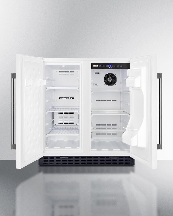 SUMMIT brings quality and value under the counter with the industry s largest collection of built-in refrigeration. Sized at 30" wide, the FFRF3075W is an all-in-one side-by-side refrigerator-freezer. The front breathing design allows built-in installation under counters, while the fully finished cabinet also enables freestanding use. This unit features a white exterior with stainless steel handles. Each compartment has a factory installed front lock for added security. The sealed back ensures easier cleanup with added space savings. Inside, the FFRF3075W features a 2.4 cu.ft. frost-free freezer compartment on the left and a 3 cu.ft. frost-free refrigerator compartment on the right. The refrigerator includes a digital thermostat allowing users to manage the temperature in each compartment, with a readout in Celsius or Fahrenheit for added convenience. Adjustable glass shelves offer cleaner spill-proof storage for fresh food items, while two removable door shelves provide additional storage space as needed. An internal fan assures the compartment is cooled evenly from top to bottom. The freezer compartment includes adjustable wire shelves to ensure proper cold air circulation. Both sides feature LED lighting to provide an attractive, energy efficient presentation. The slotted floor design is ideal for keeping bottles safely in place. Additional features include an open door alarm, high temperature alarm, and Sabbath mode setting that allows you to disable certain functions during religious observance. With its innovative all-in-one design, user-friendly features, and full frost-free operation, the FFRF3075W is a great choice for smaller kitchens looking to maximize storage space under the counter.