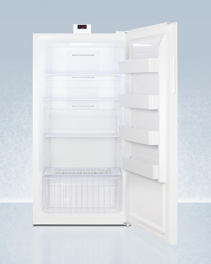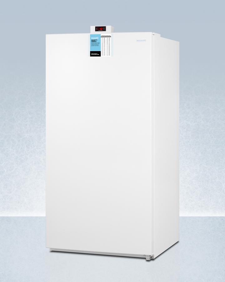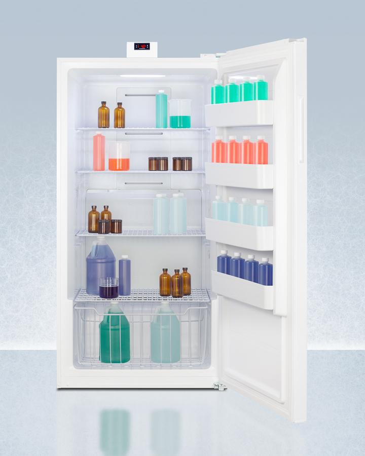 Accucold's general purpose series offers reliable cold storage in a variety of designs, including full-sized all-refrigerators ideal for clinical settings. Model FFUR19 is an upright all-refrigerator with a full 17 cu.ft. storage capacity. It comes in a white exterior finish with a right hand door swing and powerful seal to ensure items are protected. This unit has a sealed back for easier cleanup and a right angle cord to allow a better fit. The digital control panel is located on top of the cabinet, allowing you to manage the interior temperature without opening the door. The FFUF194 is designed to operate between 2 to 8 C. For a matching frost-free freezer, see the FFUF194. The FFUR19 utilizes frost-free operation, eliminating the need to manually defrost the interior. Adjustable wire shelves accommodate a variety of sizes, with a removable lower basket for additional storage. Four door racks are included. This unit features LED lighting for an efficient view. With its low maintenance design and large storage capacity, the FFUR19 is ideal for storing non-critical products in research, clinical, and industrial laboratory applications. NOTE: This unit is intended for use in healthcare, medical, life science, and laboratory settings, and is not intended for residential use.