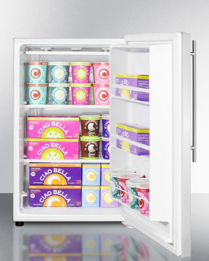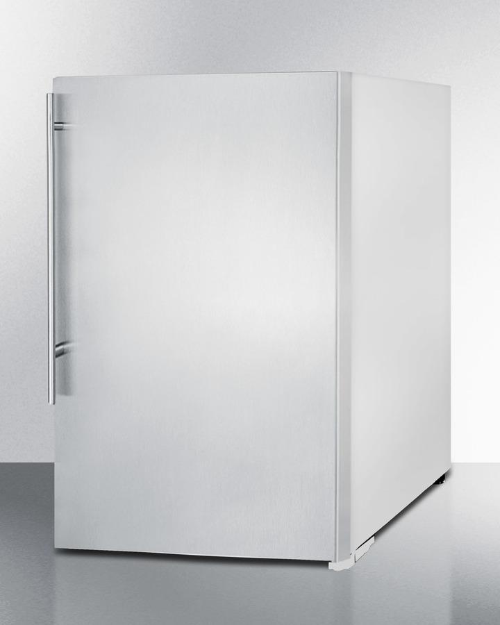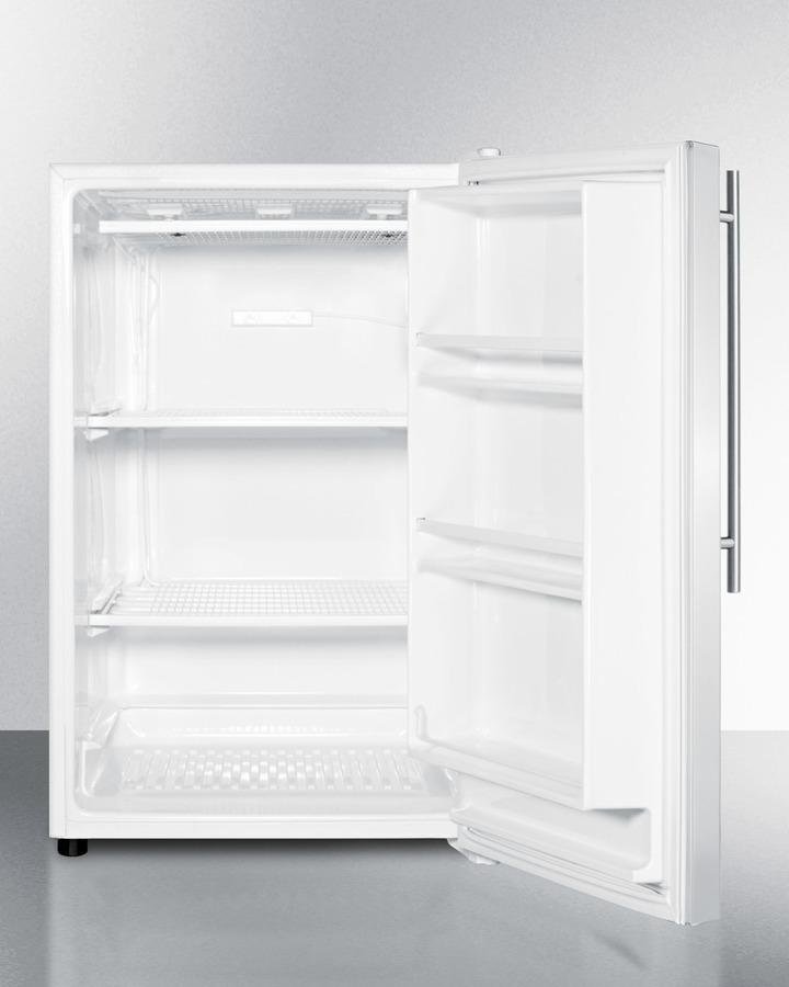 Summit's selection of North American refrigeration includes the largest capacity all-freezer in a counter height size. Model FS605SSVH is a freestanding residential upright freezer with a full 5 cu.ft. interior capacity. Two fixed wire shelves feature built-in cooling coils to ensure stored items are stored under the right temperature conditions. Three door racks offer additional storage convenience. This unit utilizes a static manual defrost system and unobtrusive technology with our simple and intuitive dial temperature controls. The FS605SSVH comes with a stainless steel wrapped door and sleek vertically mounted handle with a thin 14mm diameter, a popular to style to match many cabinets. The cabinet is a textured white finish. This unit has a non-reversible right hand door swing. With its generous storage capacity and easy-fitting size, the FS605SSVH is the perfect solution for adding extra frozen storage to shared spaces, laundry rooms, second kitchens, offices, and other settings.