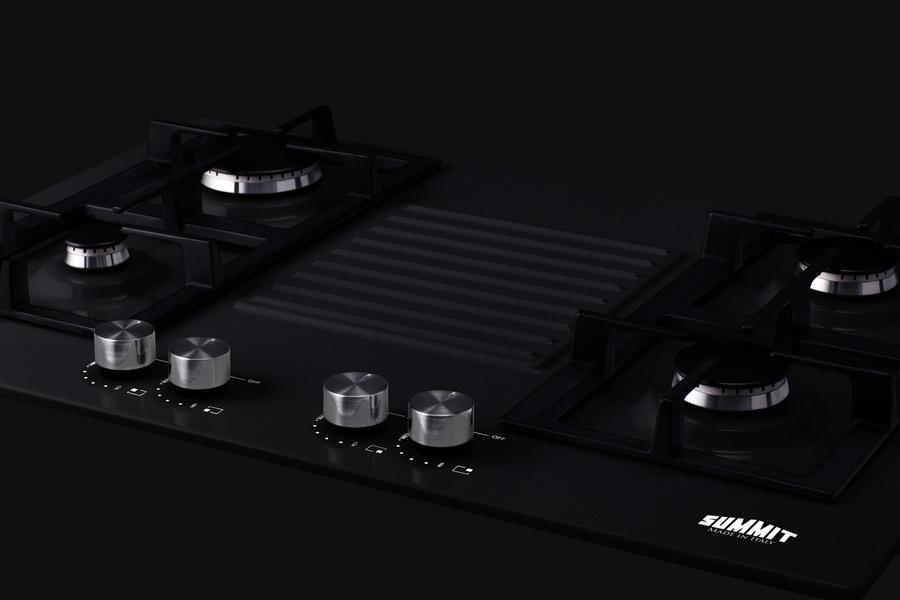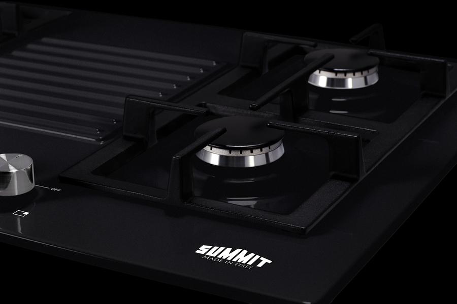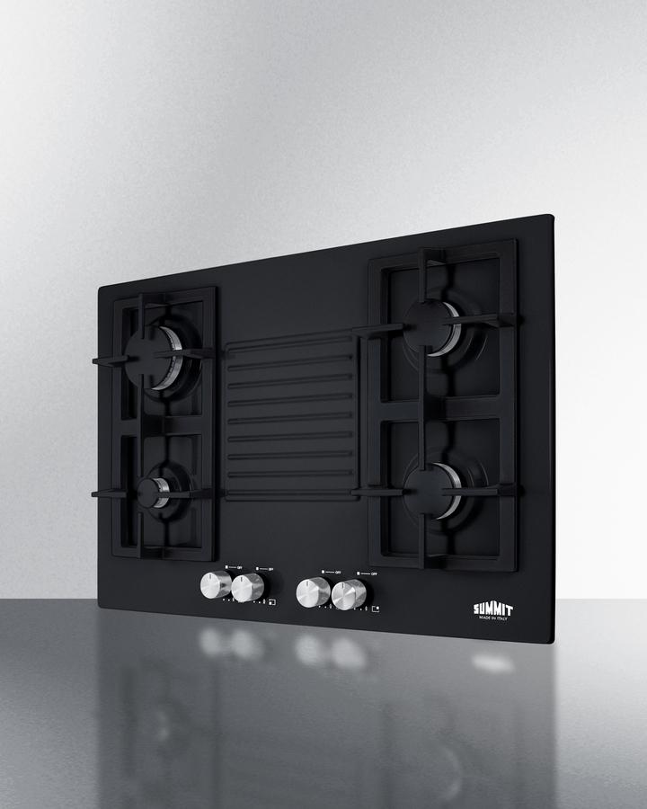 Summit gas cooktops offer a complete cooking performance in a durable, safe, and modern design, perfect for any kitchen space. Made for us in Italy, the GC432B is a four-burner 30" wide gas cooktop conveniently sized to fit traditional 24" cutouts (cutout size: 21 3/4" W x 18 7/8" D). The surface is constructed from durable steel in black matte finish, a modern look ideal for any kitchen. Two continuous cast iron grates on each side of the cooktop allow for easy movement between burners, while the open center design affords extra space when cooking with multiple pots and pans that can otherwise collide on smaller surfaces. The heavy duty brass/aluminum knobs in a steel finish are located at the front of the unit for safe, convenient access. The knobs require a gentle push-to-turn motion to ignite, and the thermocouple flame protection ensures the gas turns off if the flame is extinguished. Featuring four sealed gas burners by Defendi, the GC432B ensures quality heating for every dish. The upper-left 10,000 BTU rapid burner is ideal for boiling water or cooking larger dishes, while the bottom-left 3,400 auxiliary burner works well for precise cooking and heating. The two right 6000 BTU semi-rapid burners provide cooking power to suit most needs. The GC432B uses electric spark ignition, with a standard three-prong 115V cord included. It is set for natural gas operation with an LP conversion kit included for propane use. With its durable, modern design and complete cooking performance, the GC432B is the perfect addition to any kitchen. Additional choices are available in white (model GC431W), as well as alternate sizes and styles in stainless steel and gas-on-glass designs.