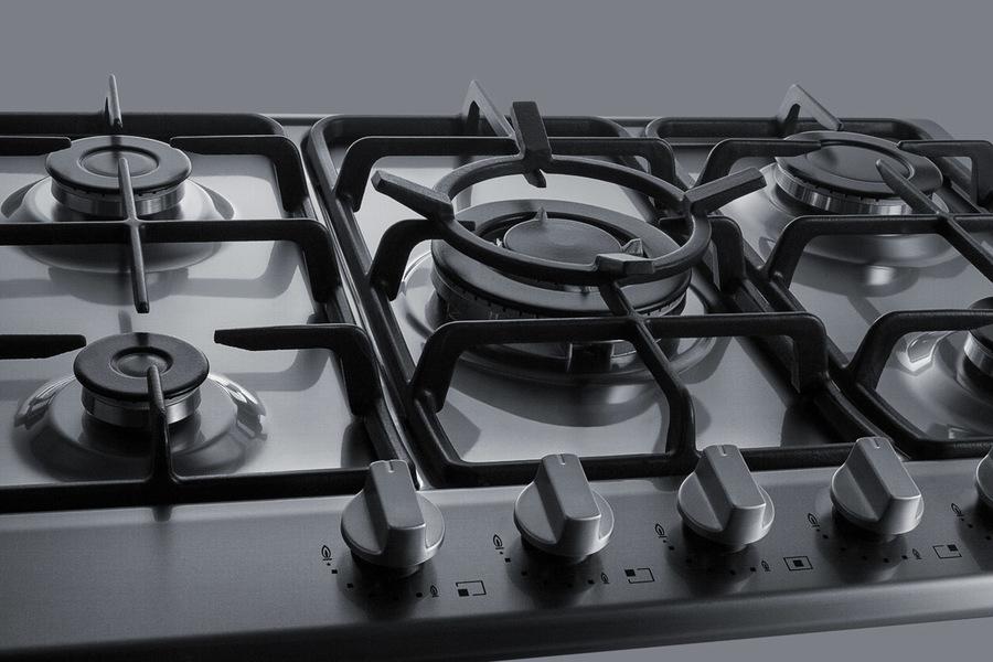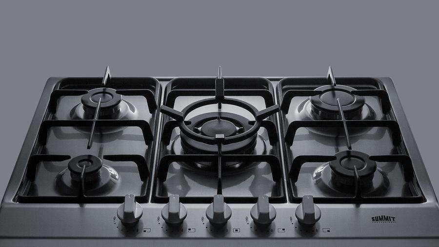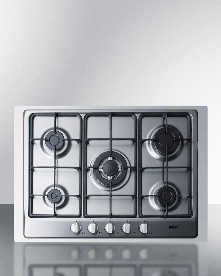 Made in Italy for SUMMIT, our deluxe gas cooktops offer the ideal cooking experience for modern kitchens. The GC527SSTK30 comes in a stainless steel finish, with color-matched knobs centrally located for easy use. The cooktops is uniquely sized at 27" wide, but ships with a stainless steel trim kit that allows the cooktop to be placed in standard 30" wide counter openings. Continuous cast iron grates are designed to hold up to heavy duty pots and pans, making it easy to side cookware from one burner to another. This unit is equipped with thermocouple flame failure protection to ensure gas will turn off if the flame is extinguished. It utilizes electronic spark ignition and comes with a pre-installed 115V power cord. For added safety, the knobs require a gentle push-to-turn motion to ignite. Five sealed Sabaf burners provide a range of cooking power to help accommodate a variety of heating needs. The center ultra rapid 11,000 BTU burner includes a dual flame and removable cast iron wok stand to offer more even heating for large cooking vessels. The right rear burner offers a 10,000 BTU cooking performance, ideal for boiling pots of water or cooking large dishes. The front right and rear left semi-rapid 6,100 BTU burners meet most general cooking needs, while the auxiliary 1,200 to 3,550 BTU front left burner allows you to achieve more precision in gentle heating. The GC527SSTK30 comes preset for natural gas operation. We include a conversion kit that lets you adjust for LP gas connections. This unit is also available in white (GC5271WTK30) and black (GC5272BTK30).