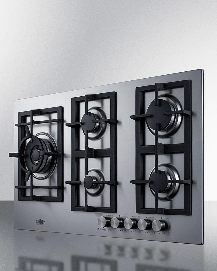 Summit s 'Made in Italy' gas cooktops offer a powerful performance in a durable, safe, and stylish design. The GCJ365SS is a 34" wide five-burner gas cooktop with a 304 grade stainless steel surface for added durability. The controls are located at the front of the unit for easy access. Its wide surface area affords ample cooking space allowing multiple burners to be used at once, while continuous cast iron grates make it easy to move heavy pots and pans between burners. The smooth surface edge adds safety in a stylish look. The heavy-duty round knobs deliver additional safety by requiring a gentle push-to-turn motion to ignite, with thermocouple flame protection to ensure the gas turns off if the flame goes out. This unit is designed to fit 32.75" W x 18.75" D counter cutouts. Featuring five gas burners manufactured by Defendi, this cooktop offers a variety of cooking options for unparalleled performance. The left-side dual flame burner has a 15,300 BTU total burner, with an included cast iron wok ring for quick heating of larger cooking vessels, and an inner flame with a maximum of 2,050 BTUs ideal for heating sauces. The top-center and lower-right semi-rapid 6,000 BTU burners meet most cooking needs. The bottom-center 3,400 BTU auxiliary burner works well for precision heating and cooking, while top right 10,000 rapid burner is ideal for boiling water or cooking larger dishes. The GCJ536SS uses electronic spark ignition and is preset for natural gas operation. A conversion kit that allows for LP gas connection is included. A standard three-pronged 115V cord is pre-installed for easy hookup. The 'Made in Italy' collection has gas cooktop options to fit any cooking need, including two, four, and five burner choices. Browse our website to explore the full collection.
