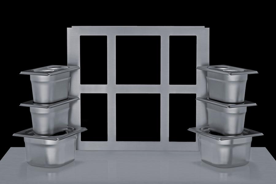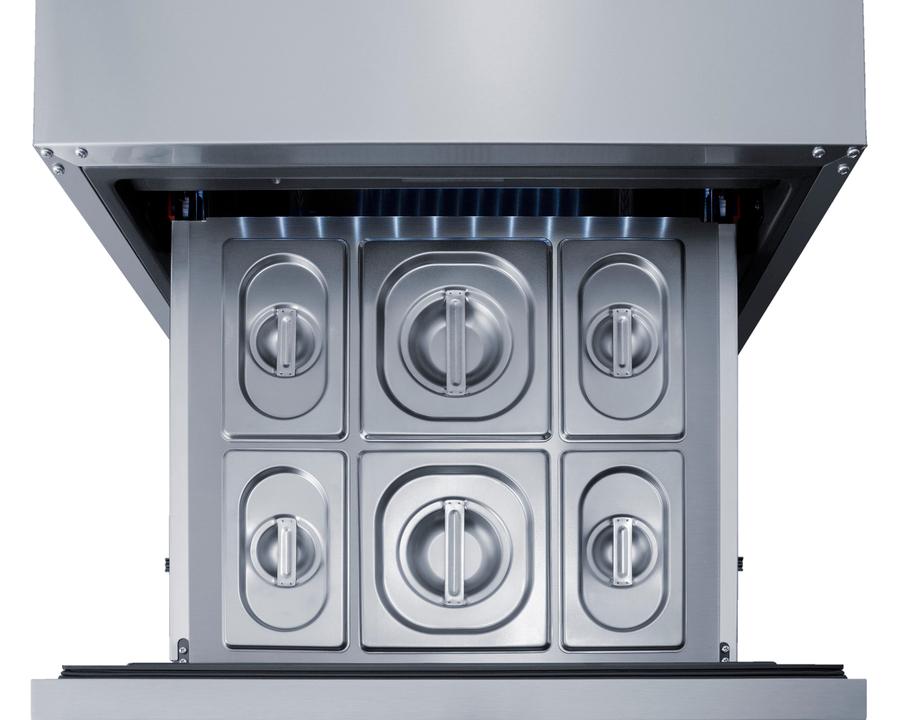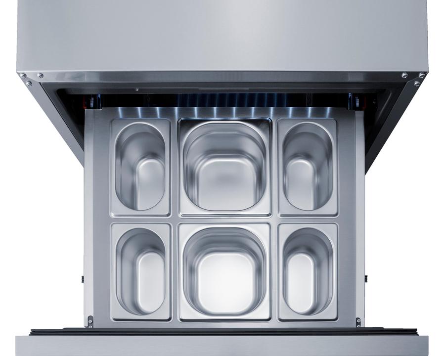 Summit's KITADRD24 offers new storage convenience for your drawer refrigerator. This set includes a stainless steel frame and six steam table pans, letting you separate items for more organized storage. We include four 1/9 pans and two 1/6 pans, each with its own removable lid. No assembly is required and the set can be added or removed from your refrigerator as needed. The KITADRD24 is compatible with Summit's ADRD24 2-drawer all-refrigerator.