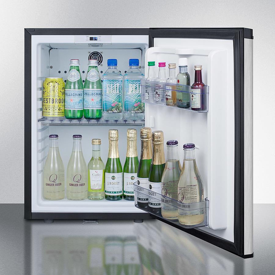Summit offers a selection of minibars perfectly sized for compact spaces. Sized at under 16 inches wide, the MB26SS is a compact minibar with a stainless steel door. Its fully finished black cabinet allows for freestanding use. The user-reversible door affords variation in unit placement and includes a factory-installed lock for added security. The digital controls with six temperature levels makes adjusting the temperature easy. Inside, the MB26SS has 1.1 cu.ft. of storage space and a white interior for full visibility of contents. A compressor-based cooling system ensures proper refrigeration to keep stored items cold, while the laboratory-tested operation keeps it quiet with a sound level of 33.4 decibels, sure to not disturb guests' sleep. Two removable half shelves, with ten placement options, lets you maximize storage capacity. Two door racks accommodate taller items. The LED light illuminates the interior for quick viewing, and the automatic defrost ensures minimum user maintenance. With a compact size and user-friendly design, the MB26SS is the perfect choice for hotels, offices, and other settings in need of reliable, quiet cooling in a slim fit.