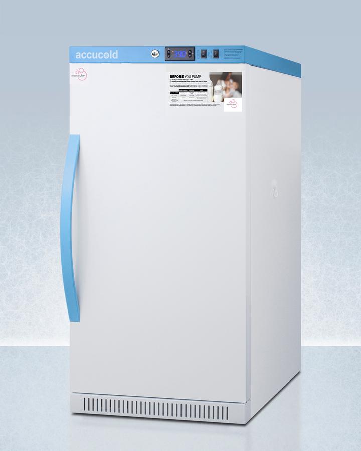 Accuold's MOMCUBE(R) is a highly reliable, hospital-grade refrigerator designed for mother's milk storage. All MOMCUBE(R) units are an ideal addition to employee wellness rooms, daycare centers, and work environments seeking to adhere to Section 4207 of the Patient Protection and Affordable Care Act. They are laboratory-tested to stay within the CDC's recommended temperature range, whereas similar dorm and residential-style units operate at temperatures that are unsuitable for breast milk storage. Inside, the MLRS31BIADAMC has four adjustable wire shelves for increased air circulation. A cycle defrost system allows for little to no maintenance of the unit, while a soft LED light is included with an on/off switch for easy viewing of the interior. The MOMCUBE(R) is sized at 32" hight to fit under lower counters complying with ADA guidelines for accessibility. It is designed for freestanding or recessed installation. It comes in a white cabinet finish with a blue accented control panel. An LED display that allows the user to monitor and change the temperature as needed. Several alarms ensure temperature stability, and the factory-installed external door lock offers added security. The self-closing, reversible door allows for flexibility in unit placement. The factory installed antimicrobial handle is powder-coated with naturally occurring silver ions, which help to reduce the spread of germs, allowing for a safer, cleaner user experience, while the hospital grade cord with 'green dot' plug is also included for added safety. MOMCUBE(R) units of various capacity, heights, and interiors are available. Explore the entire MOMCUBE(R) Series on our website or contact our sales team at 718-893-3900 ext. 509 for more options.
