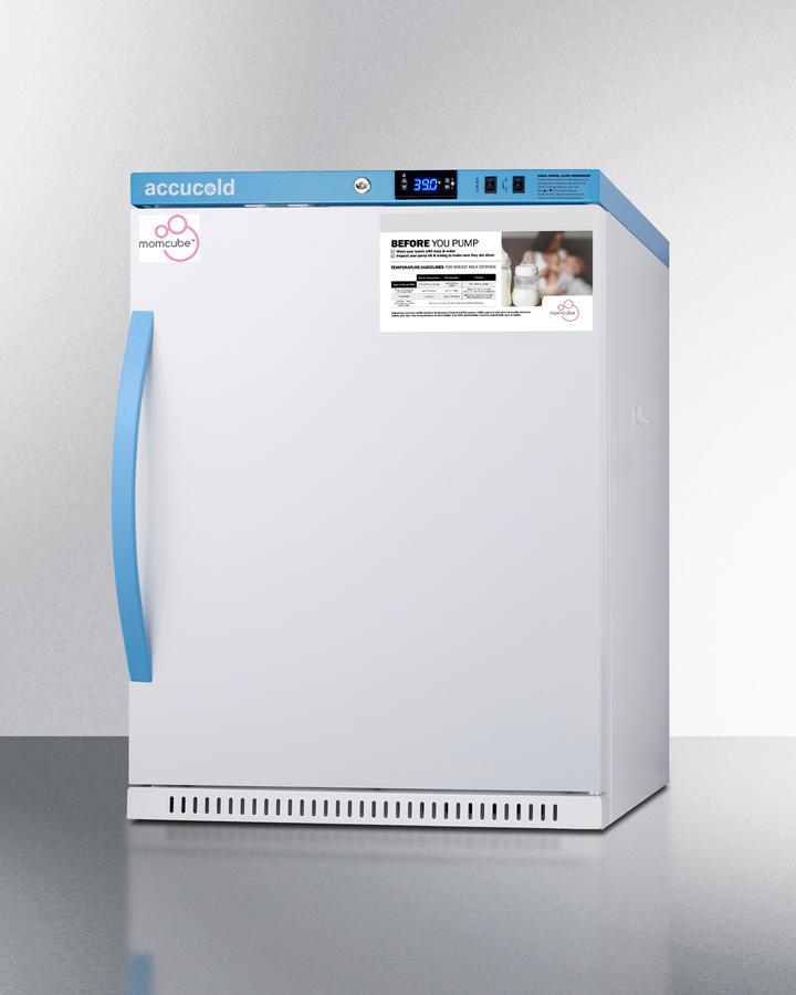 Accuold's MOMCUBE(R) is a highly reliable, hospital-grade refrigerator designed for mother's milk storage. All MOMCUBE(R) units are an ideal addition to employee wellness rooms, daycare centers, and work environments seeking to adhere to Section 4207 of the Patient Protection and Affordable Care Act. They are laboratory-tested to stay within the CDC's recommended temperature range, whereas similar dorm and residential-style units operate at temperatures that are unsuitable for breast milk storage. Inside, the MLRS62BIADAMCLK has two lockers, each with a combination lock to ensure privacy for mothers storing their milk, which can be reset or overridden as needed with included master keys. A cycle defrost system allows for little to no maintenance of the unit, while a soft LED light is included with an on/off switch for easy viewing of the interior. The MOMCUBE(R) is sized at just under 32" hight to fit under lower counters complying with ADA guidelines for accessibility. It is designed for freestanding or recessed installation. It comes in a white cabinet finish with a blue accented control panel. An LED display that allows the user to monitor and change the temperature as needed. Several alarms ensure temperature stability, and the factory-installed external door lock offers added security. The self-closing, reversible door allows for flexibility in unit placement. The factory installed antimicrobial handle is powder-coated with naturally occurring silver ions, which help to reduce the spread of germs, allowing for a safer, cleaner user experience, while the hospital grade cord with 'green dot' plug is also included for added safety. MOMCUBE(R) units of various capacity, heights, and interiors are available. Explore the entire MOMCUBE(R) Series on our website or contact our sales team at 718-893-3900 ext. 509 for more options.