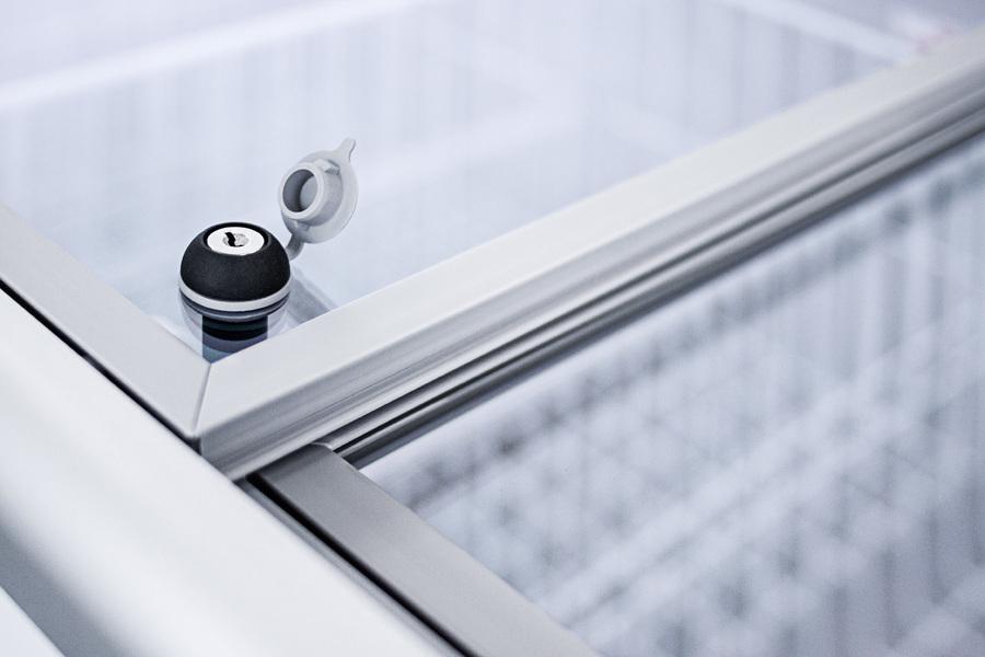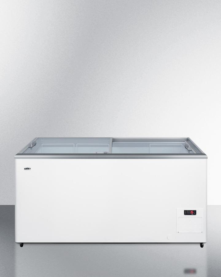 Summit Commercial's line of flat top ice cream freezers features a deluxe European design to provide quality storage and long-lasting convenience. Made for us by Elcold in Denmark, the NOVA45 features two tempered glass lids on ball-bearing glides that open and close smoothly to save your staff time and ensure ice cream isn't overexposed to warmer air temperature. This unit includes a removable keyed lock to allow users the option of securing their goods. The white cabinet suits any setting, while the gray lid trim offers an added touch of clean style. We include a set of sturdy commercial casters for users to install if they prefer the freezer more mobile. The digital thermostat is externally located for easy temperature management, with a wide range from -13 to 23 F to accommodate a variety of desserts. We pre-set the unit to -4 F. Inside, the NOVA45 features a steel interior in a clean white finish designed for lasting durability in busy commercial settings. We include three epoxy coated wire novelty baskets, ideal for storing frozen treats and designed to easily glide back and forth as needed. This unit utilizes a manual defrost cooling system with environmentally friendly R290a cooling agent and extra thick insulation to ensure added reliability. A drain is included for easy defrosting. The NOVA45 is UL-S listed to NSF-7 commercial standards. Additional sizes are available.