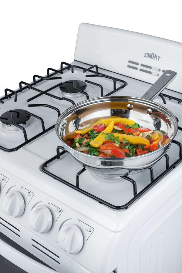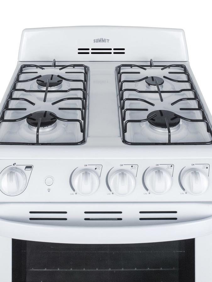 SUMMIT's line of slim-fitting gas ranges made in North America brings quality and value to space-challenged kitchens. Sized at 24" wide, the RG244WS features a large oven with an interior light and wide window for easy cooking visibility. Two slide-out racks include a safety brake system, with four position options to let you accommodate all sizes and shapes. The broiler is located in a lower drop-down compartment. We include a two-piece broiler pan with lid. The RG244WS comes in a classic white finish, with color-matched push-to-turn knobs and an easy-to-grab handle. This model utilizes electronic spark ignition and features four sealed burners for safer, cleaner cooking. One 12,000 BTU burner offers faster cooking for larger vessels, with two standard 9,500 BTU burners and a smaller 5,000 BTU burner for lower heating needs. The high backguard helps to protect your walls from spills, with enamel grates for lasting durability. The unit ships set for natural gas but includes its own LP kit for aftermarket conversion. With its clean look and unique size, the RG244WS is the ideal gas range for apartment and small home kitchens. NOTE: This unit replaces model RG244W but features an upgraded sealed burner design.