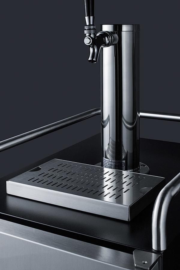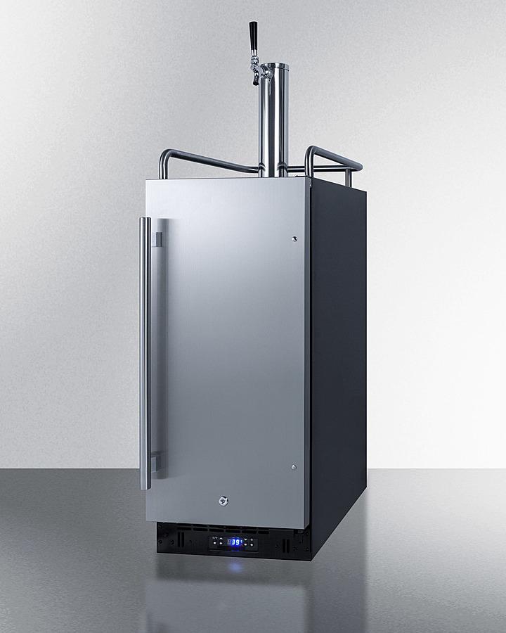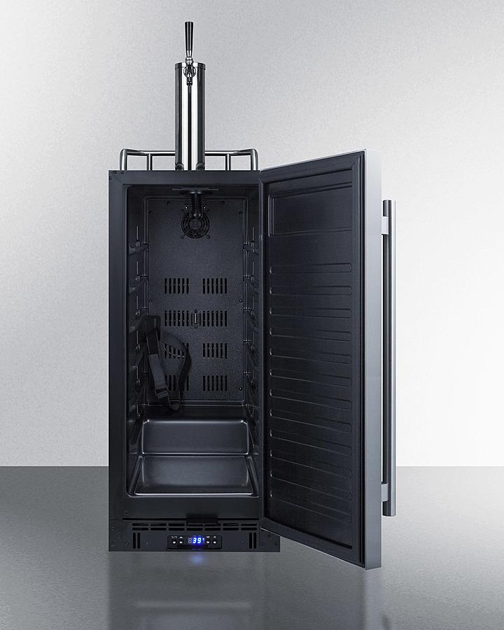 Summit offers a complete line of built-in kegerators/coffee dispensers designed for use in commercial establishments. The SBC15CF features a versatile design that meets NSF-7 and UL-471 commercial standards but is also approved for residential applications. Sized at 15" wide, it features a front-breathing design for built-in installation under counters and a fully finished cabinet for freestanding use. A stainless steel door and black cabinet finish afford added elegance to any setting, while the stainless steel handle completes the look. The sealed back allows for easy cleaning of the unit. Additional features include a removable two-piece stainless steel drip tray to collect spills and a chrome guard rail to help keep glasses and mugs in place. The user-reversible door swing makes it easy to accommodate any location s setup and four included casters (two are locking) make movement of the unit easy. A factory-installed lock provides added security. Inside, the 2.9 cu. ft. interior can hold a 1/6 (sixtel) coffee keg. Two chrome shelves, with six placement options, allow the kegerator to also function as a beverage refrigerator. A digital thermostat makes it easy to manage the temperature, while the external digital display has a readout in Celsius or Fahrenheit. Automatic defrost operation ensures minimal user maintenance. We include a commercially approved tap kit that includes everything you need to serve flat cold brew coffee, including a stainless steel draft tower, regulator, and Nitrogen tank. A tap cool system keeps your coffee cold as it goes through your tower, and a Velcro strap holds the Nitro tank in place. A stainless steel floor plate provides added protection when placing and removing kegs. For a similar unit designed to serve nitro-infused coffee, see the SBC15NCF. You can also create your own custom cold brew kegerator by combining any of our "NK" beer dispensers with our selection of cold brew tap kits. Note: Due to its door design, the SBC15CF requires an additional 1/4" of width for the door to open to a full 90 . If placing this unit against a right angle wall, be sure to accommodate this extra space.