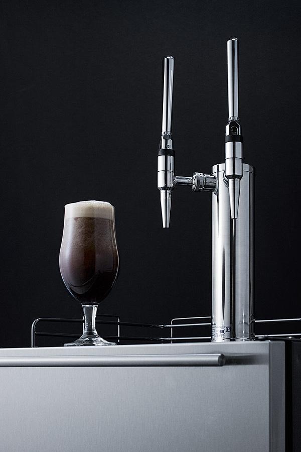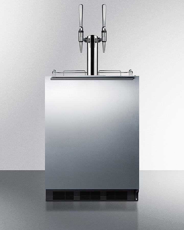Summit Commercial brings unique appliance choices to ADA compliant settings with a new line of commercial coffee dispensers made in Europe. Sized at 32 inches high, the SBC58BLBIADANCFTWIN is designed to fit under lower ADA compliant counters. The front-breathing design allows built-in installation, while the fully finished black cabinet also enables freestanding use. This unit features a user-reversible 304 grade stainless steel wrapped door complete with a stainless steel handle mounted horizontally for a modern look. We include a guard rail (ships uninstalled) and removable two-piece stainless steel drip tray for cleaner service. This unit ships with an NSF-listed stainless steel tap kit that includes everything you need to serve nitro cold brew coffee, including a standard dual tap draft tower, regulator, and nitrogen tank. Inside, the SBC58BLBIADANCFTWIN is designed to hold two 1/6 (sixtel) kegs (note: interior does not accommodate a standard half barrel). Automatic defrost ensures easy user maintenance, with a seamless interior for easier cleaning. The stainless steel floor offers added durability when loading kegs. This unit includes an interior light with an on/off rocker switch and a dial thermostat for easy and intuitive temperature management. The nitrogen tank bracket is located inside, allowing you to keep the tank inside and save on exterior depth. The SBC58BLBIADANCFTWIN is ETL-S listed to NSF-7 commercial standards. Additional ADA compliant kegerator choices are available with panel-ready or glass doors. Browse our complete line for more choices.