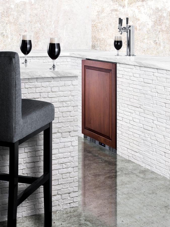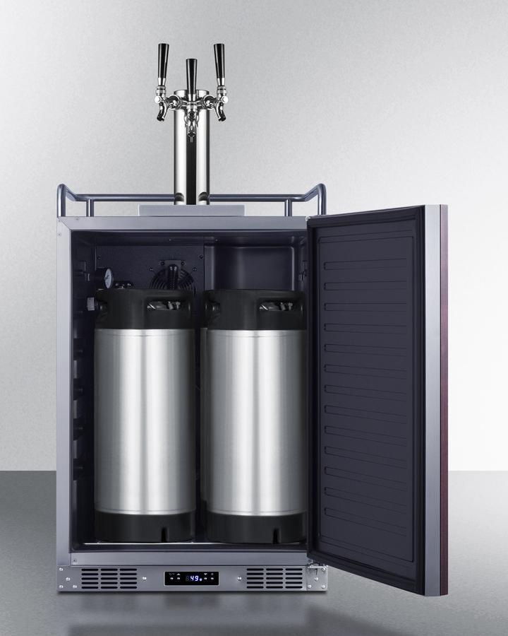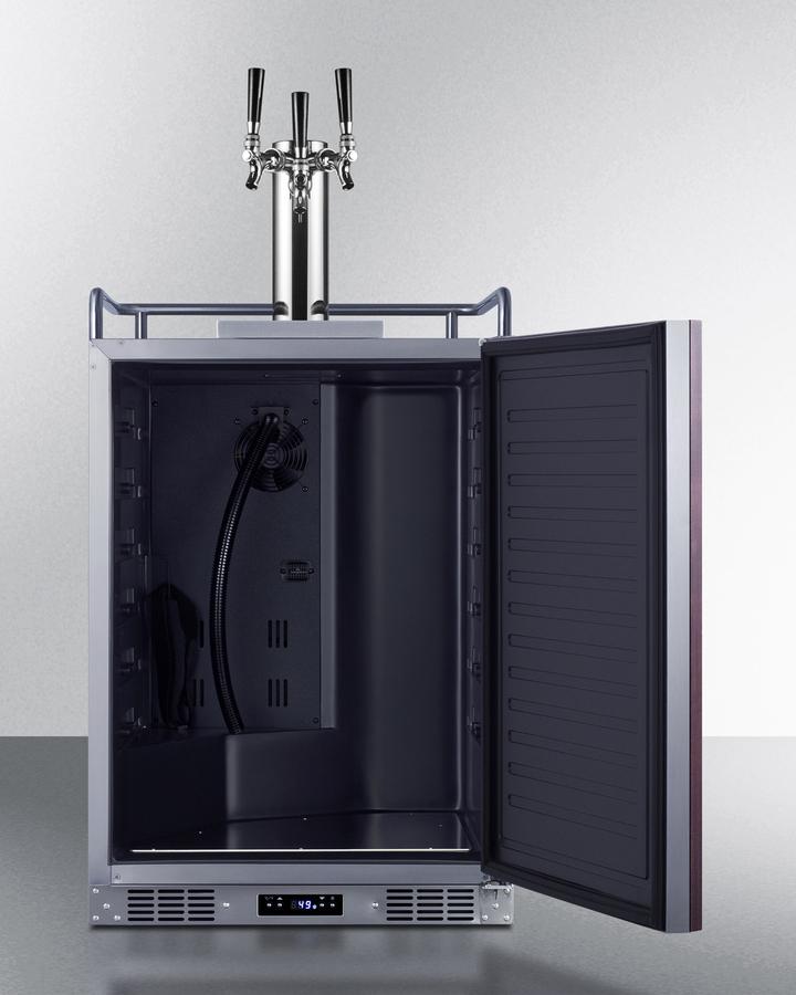 Summit manufactures a complete line of versatile kegerators capable of built-in installation in indoor or outdoor home settings. The SBC682PNRTRIPLE is a full-sized triple tap beer dispenser approved for both residential or commercial use. Sized at just 24" wide, it features a front-breathing system for built-in installation and a fully-finished cabinet that also allows freestanding use, with an included caster set for optional mobility. The exterior features 304 grade stainless steel construction for safe, weatherproof use in the outdoors. The door is designed to accept overlay panels (sized at 29 3/4" H x 23 5/16" W at a 3/4" thickness) to allow you to create a custom look to best suit your own kitchen design. This unit ships with a right hand door swing. For a left hand version, add option "LHDHinge." Additional features include a removable two-piece stainless steel drip tray to collect spills and a chrome guard rail to help keep glasses and mugs in place. This unit has a sealed rear for added protection from the elements. Inside, the 5.6 cu. ft. interior can accommodate a full half or quarter keg, or up to three Cornelius or sixth barrel kegs. We include a complete commercial grade triple tap kit for dispensing three of your favorite beers, including a Sankey tap system and triple tap draft tower, along with a CO2 tank and regulator. The floor is constructed from stainless steel for added protection when loading and removing kegs. Two chrome shelves, with six placement options, allow the kegerator to also function as a beverage refrigerator. A digital thermostat makes it easy to manage the wide range temperature, while the external digital display has a readout in Celsius or Fahrenheit. Automatic defrost operation ensures minimal user maintenance. The Memory IC function recovers the unit's last settings in the case of a power outage or disruption. With its solid construction, user-friendly features, and attractive design, the SBC682PNRTRIPLE is the perfect beer dispenser for indoor or outdoor kitchens. Additional choices are available with alternate tapping options, including choices to dispense wine and coffee. Browse the full Summit line to explore all of your options.