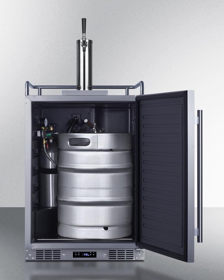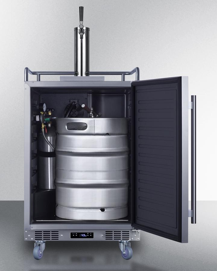 Summit manufactures a complete line of versatile kegerators capable of built-in installation in indoor or outdoor home settings. The SBC683OS is a full-sized beer dispensers approved for both residential or commercial use. Sized at just 24" wide, it features a front-breathing system for built-in installation and a fully-finished cabinet that also allows freestanding use, with an included caster set for optional mobility. The exterior door and cabinet feature 304 grade stainless steel construction for safe, weatherproof use in the outdoors. The user-reversible door includes a pro style vertically mounted handle to complete the look. Additional features include a removable two-piece stainless steel drip tray to collect spills and a chrome guard rail to help keep glasses and mugs in place. This unit has a sealed rear for added protection from the elements. Inside, the 5.6 cu. ft. interior can accommodate a full half or quarter keg, or up to three Cornelius or sixth barrel kegs. We include a complete commercial grade tap kit for dispensing your favorite beer, including a Sankey tap system and single tap draft tower, along with a CO2 tank and regulator. A tap cool system keeps your beer cold as it goes through your tower, and a Velcro strap holds the tank in place. The floor is constructed from stainless steel for added protection when loading and removing kegs. Two chrome shelves, with six placement options, allow the kegerator to also function as a beverage refrigerator. A digital thermostat makes it easy to manage the wide range temperature, while the external digital display has a readout in Celsius or Fahrenheit. Automatic defrost operation ensures minimal user maintenance. The Memory IC function recovers the unit's last settings in the case of a power outage or disruption. With its solid construction, user-friendly features, and attractive design, the SBC683OS is the perfect beer dispenser for indoor or outdoor kitchens. Additional choices are available with alternate tapping options, including choices to dispense wine and coffee. Browse the full Summit line to explore all of your options.