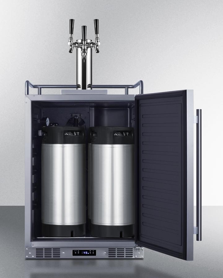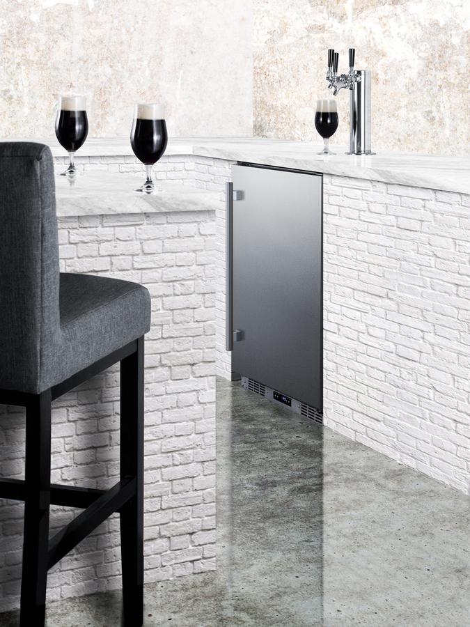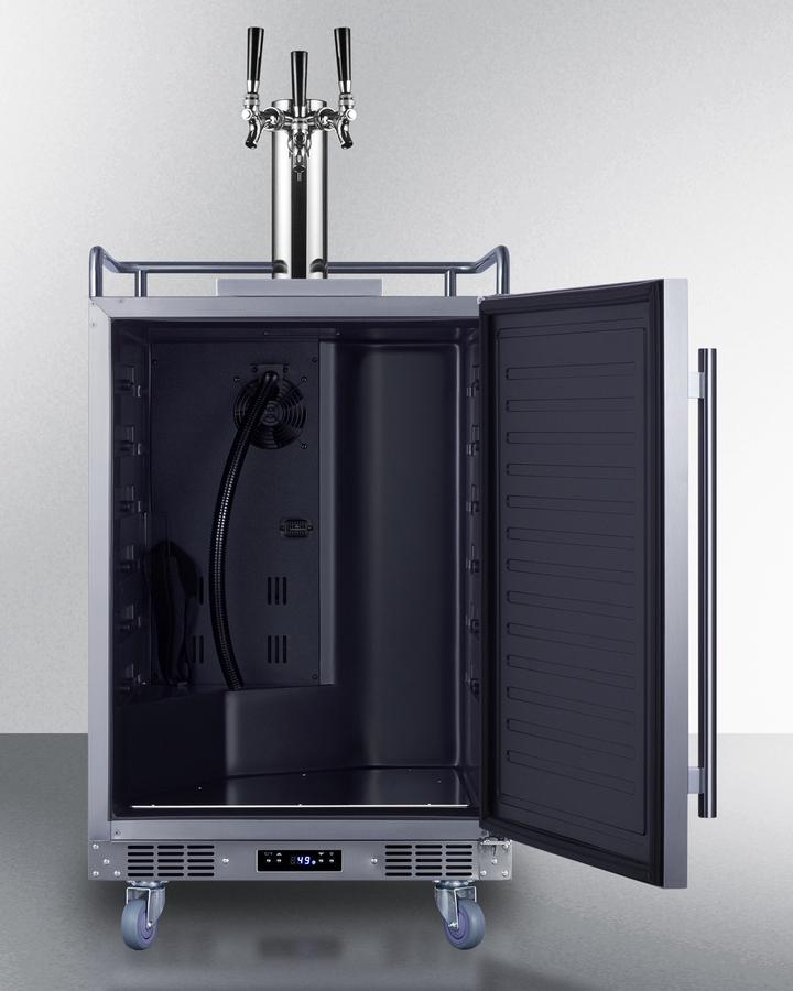 Summit manufactures a complete line of versatile kegerators capable of built-in installation in indoor or outdoor home settings. The SBC683OSTRIPLE is a full-sized beer dispensers approved for both residential or commercial use. Sized at just 24" wide, it features a front-breathing system for built-in installation and a fully-finished cabinet that also allows freestanding use, with an included caster set for optional mobility. The exterior door and cabinet feature 304 grade stainless steel construction for safe, weatherproof use in the outdoors. The user-reversible door includes a pro style vertically mounted handle to complete the look. Additional features include a removable two-piece stainless steel drip tray to collect spills and a chrome guard rail to help keep glasses and mugs in place. This unit has a sealed rear for added protection from the elements. Inside, the 5.6 cu. ft. interior can accommodate a full half or quarter keg, or up to three Cornelius or sixth barrel kegs. We include a complete commercial grade tap kit for dispensing your favorite beer, including a Sankey tap system and triple tap draft tower, along with a CO2 tank and regulator. A tap cool system keeps your beer cold as it goes through your tower, and a Velcro strap holds the tank in place. The floor is constructed from stainless steel for added protection when loading and removing kegs. Two chrome shelves, with six placement options, allow the kegerator to also function as a beverage refrigerator. A digital thermostat makes it easy to manage the wide range temperature, while the external digital display has a readout in Celsius or Fahrenheit. Automatic defrost operation ensures minimal user maintenance. The Memory IC function recovers the unit's last settings in the case of a power outage or disruption. With its solid construction, user-friendly features, and attractive design, the SBC683OSTRIPLE is the perfect beer dispenser for indoor or outdoor kitchens. Additional choices are available with alternate tapping options, including choices to dispense wine and coffee. Browse the full Summit line to explore all of your options.