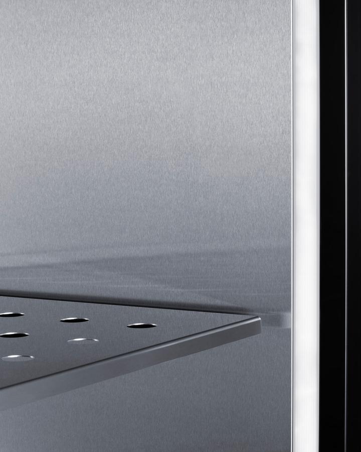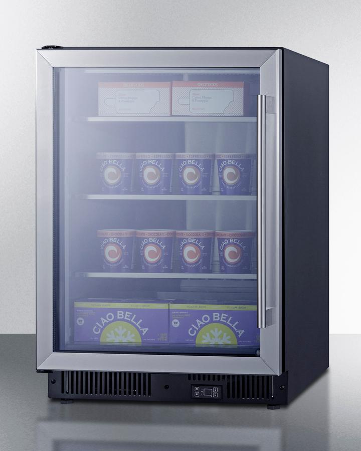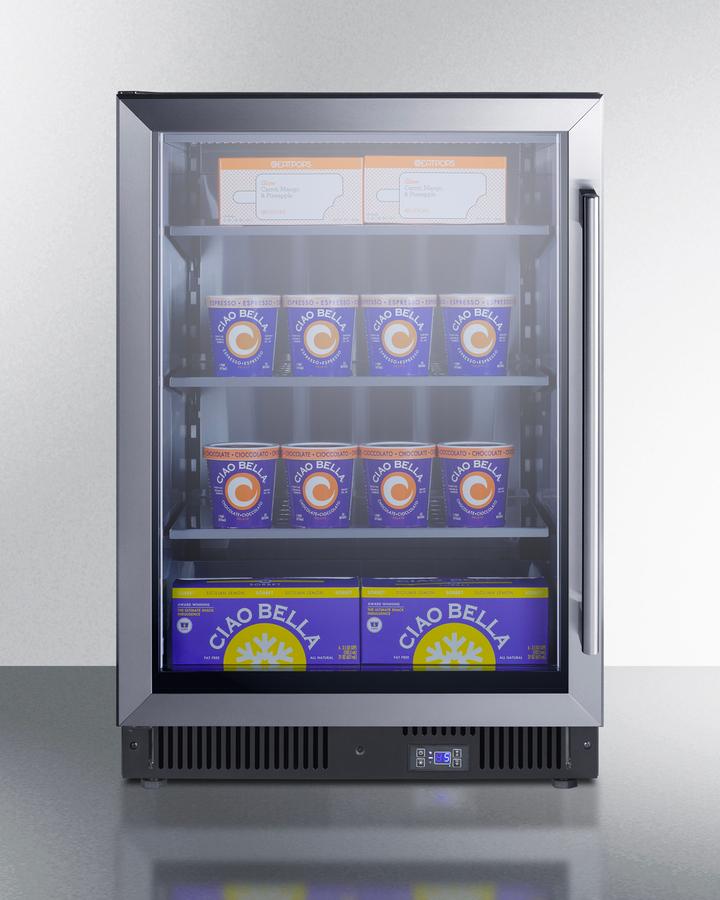 Summit's commercial series of undercounter freezers offers an attractive display for maximizing impulse sales and keeping products under reliable cold storage conditions. The SCF475LHD is a frost-free freezer with an easy-fitting 24" footprint and a front-breathing design ideal for built-in installation under counters. The stainless steel trimmed door features triple-pane tempered glass that is vacuum insulated with a low-e coating, helping to improve energy efficiency and ensure items are on full display. LED lighting in the side walls helps to provide attractive illumination. For increased security, the unit features a factory-installed lock in the kickplate. The digital thermostat is externally located for easy temperature management. This unit comes with a left-hand door swing and pro style handle. Inside, the SCF475LHD features 5.14 cu.ft of storage space and stainless steel construction for improved durability and sanitation. A commercial-grade cantilevered shelving system allows flexible storage. Three perforated steel shelves are designed to hold up to heavy duty commercial use and ensure proper cold air circulation. This freezer includes a SuperFreeze setting, which is great for freezing newly loaded foods quickly. Additional features include an open door alarm, high-temperature alarm, and Sabbath mode setting that lets you disable some of the electrical elements during periods of observance. The SCF475LHD is ETL-S listed to NSF-7 for use in commercial settings. With its deluxe style, user-friendly features, and low maintenance frost-free operating system, this freezer offers premium value for bars, restaurants, hotel marketplaces, and other commercial environments. Create a matching set by pairing this with the SCR610BL, our 24" wide stainless steel beverage center.