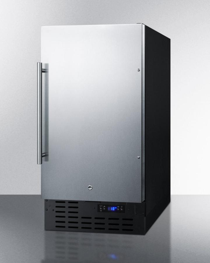 SUMMIT brings true convenience to small kitchen spaces with the SCFF1842SSADA, an 18" wide fully frost-free all-freezer designed for use under lower ADA compliant counters. The 32" high SCFF1842SSADA is front-breathing for built-in use under counters, but also features a fully finished cabinet to allow freestanding use. The reversible stainless steel wrapped door includes a factory installed lock and professional handle. This unit comes with a black cabinet and sealed back. Inside, the SCFF1842SSADA is fully frost-free to minimize user maintenance, with slide-out chrome shelves that can be adjusted to accommodate a variety of items in the 2.7 cu.ft. interior. This unit includes a digital thermostat for easy and intuitive temperature control. With a uniquely slim size and user-friendly features, the SCFF1842SSADA is the ideal freezer for space-challenged homes. This model meets UL-471 standards.