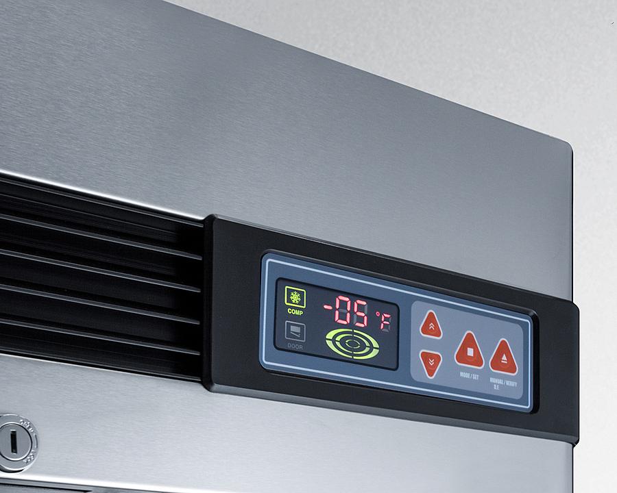 Summit Commercial's line of reach-in refrigeration features durable construction built to NSF-7 commercial standards. Made in South Korea, the SCFF237LH is a commercial all-freezer with a complete stainless steel cabinet. The stainless steel door features a self-closing design to help protect stored contents in busy commercial settings where customers may not take the time to make sure the door is closed. It will remain open when pushed to 90 , making it easier to load and unload the unit. The sealed back design helps to simplify cleanup. This unit features a factory-installed lock located towards the top of the door for convenient security. We include a set of locking casters for optional installation. The door has a left hand swing. For the same unit with the door opening from the other side, see the SCFF237. The SCFF237LH features a large 23 cu.ft. interior constructed from stainless steel for easy cleanup and lasting durability. The cantilevered shelving system allows you to adjust the four vinyl-coated shelves to virtually any position, making it easy to accommodate any sized item. This unit is designed to fit common commercial baking trays. The LED lighting offers an energy efficient display when the door is opened. This unit utilizes adjustable cycle defrost operation to avoid temperature spikes, with a top-mounted forced air cooling system to ensure rapid temperature recovery. To ensure optimum storage conditions, the SCFF237LH is equipped with a microprocessor temperature controller that makes it easy for staff to adjust the temperature. The large digital LED readout displays the current and high/low temperatures in Celsius or Fahrenheit. An audible and visual temperature alarm sounds if the unit rises or falls above a user-set range. Additional alarms include a power failure alert, door open alarm, and a condenser cleaning reminder. Designed with hydrocarbon refrigerant, the SCFF237LH provides an energy efficient solution to large capacity storage. It is ETL-S listed to NSF-7 commercial standards. For a matching refrigerator, see the SCRR232.