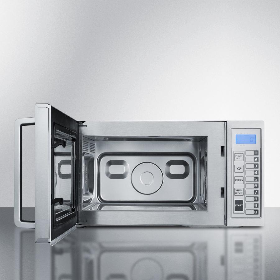 Summit SCM1000SS is a countertop microwave in complete stainless steel. This 1000 watt countertop unit features a robust design for lasting durability. The stainless steel interior has a flat bottom with no turntable, ideal for high usage institutional settings. The SCM1000SS features a complete stainless steel exterior, with an easy-to-grab handle. Digital controls offer multiple power levels for proper cooking. Cooking programs can also be saved for fast one-touch use. This model also includes a programmable child lock and counter function to keep track of how many times the oven has been used. With its durable construction and multiple cooking features, the SCM1000SS is the ideal choice for various applications in need of a mid-sized microwave built to last.