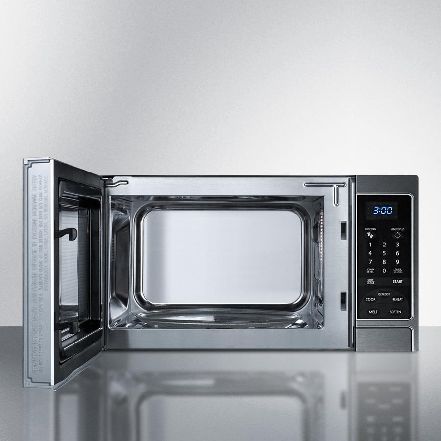 SUMMIT SCM853 brings modern style to the classic microwave oven. This 900W unit comes with a brushed stainless steel exterior and a polished stainless steel interior for easy cleanup. The digital controls offer a variety of cooking functions, with options for popcorn, reheating, defrosting, melting, and softening butter. Multiple power levels allow you to program two cooking steps and a child lock ensures added safety. This model includes a glass turntable and a push-to-open button. With an attractive design and full cooking convenience, the SCM853 is the ideal compact microwave for small kitchens.